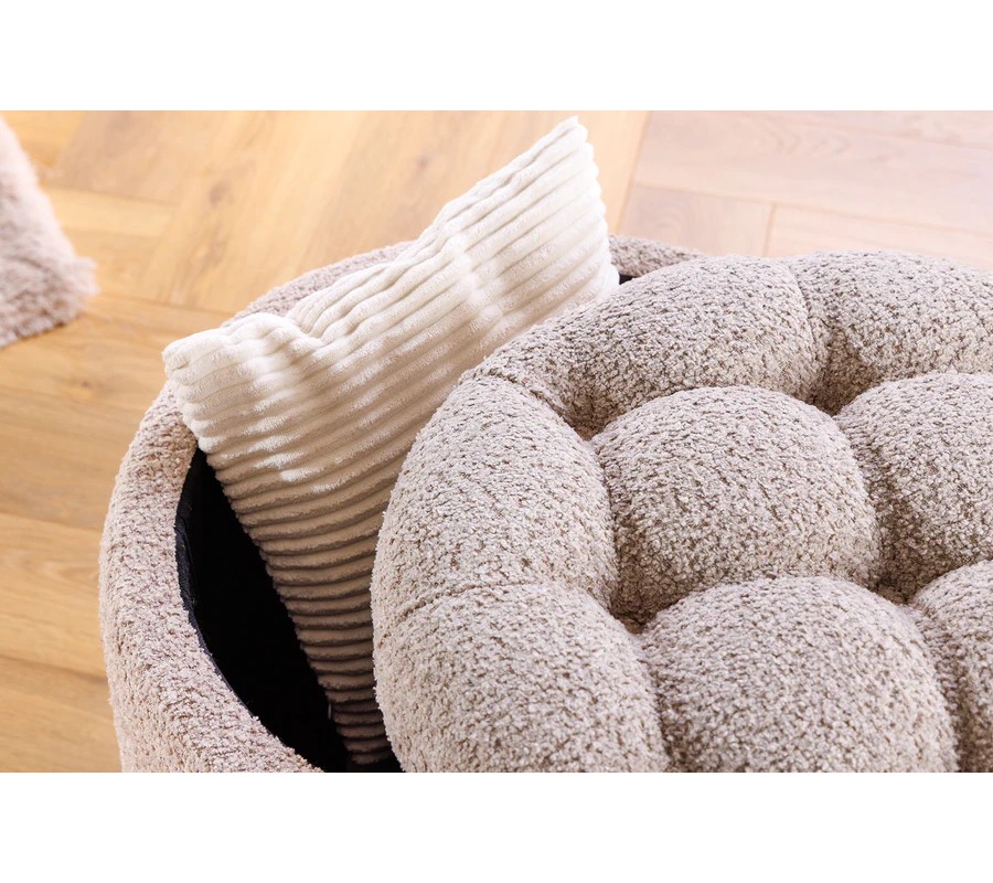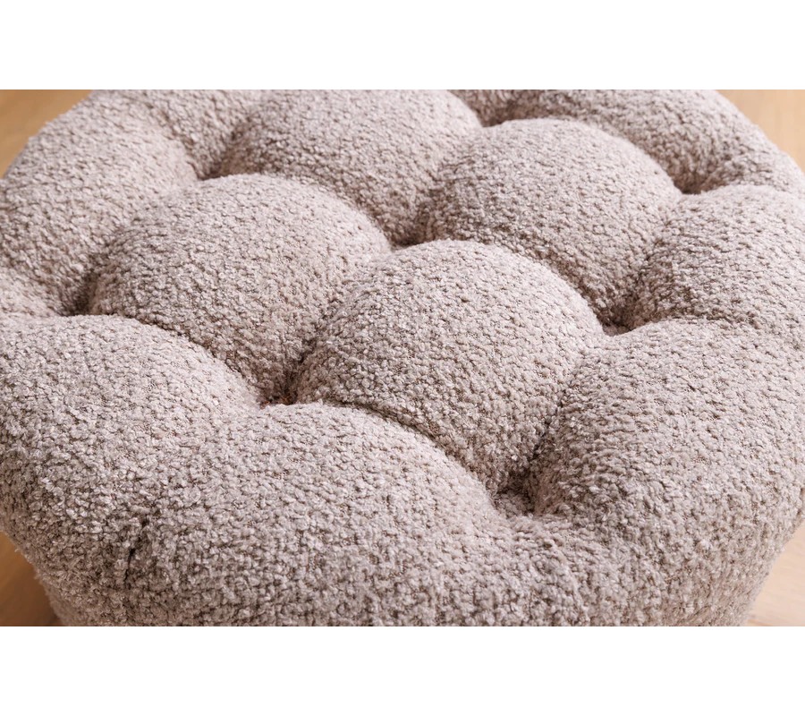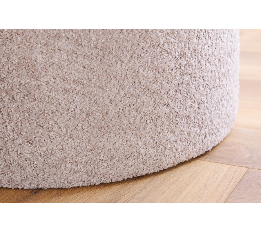 Poťah taburetky je vyrobený z mäkkej bouclé látky, ktorá je známa svojou výraznou textúrou, pripomínajúcou jemne kučeravú tkaninu. Povrch je príjemný na dotyk a dodáva pocit útulnosti. Farba je jemná béžová s odtieňom šampanského s neutrálnym podtónom, ktorý umožňuje jednoduché kombinovanie s rôznymi farebnými schémami.