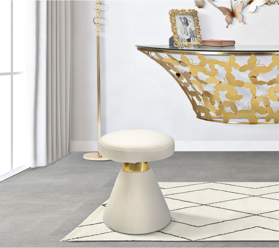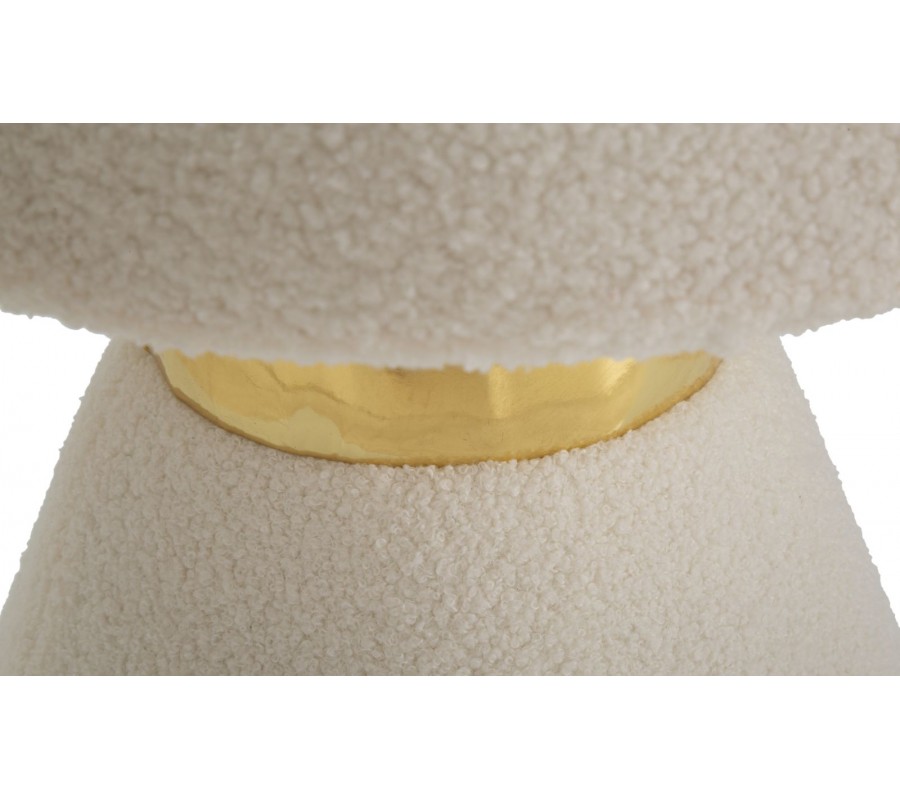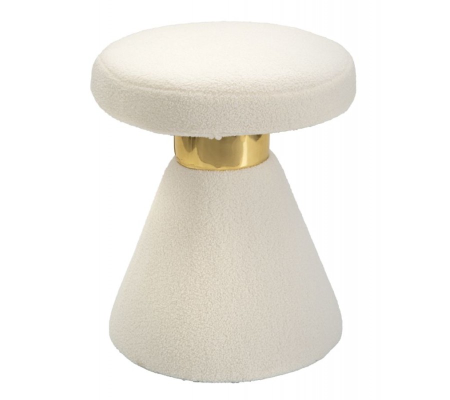 Art deco okrúhla taburetka Vinia s bouclé poťahom v krémovej farbe so zlatým detailom a s kužeľovou nohou 51 cm