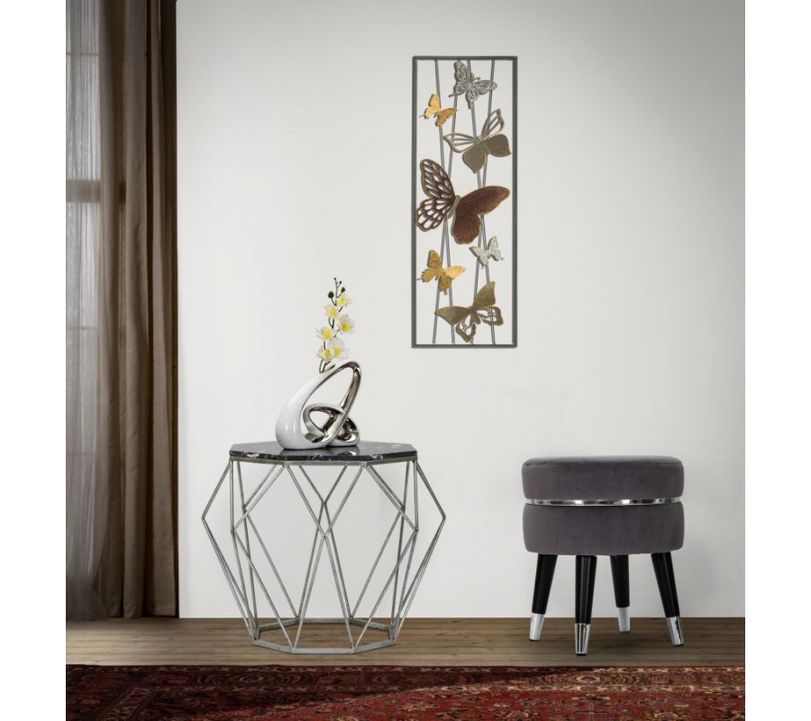 Dizajn je doplnený striebornými detailmi, ktoré sa nachádzajú po obvode taburetky a na koncoch nožičiek, čím podčiarkujú jej exkluzívny charakter a dodávajú vizuálnu ľahkosť.