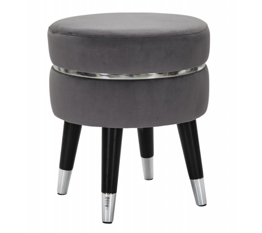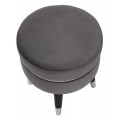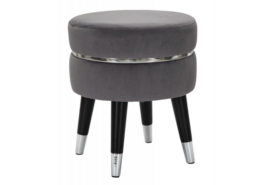 Art deco okrúhla zamatová čalúnená taburetka Laurentia v sivej farbe s čiernymi nožičkami a striebornými detailmi 40 cm