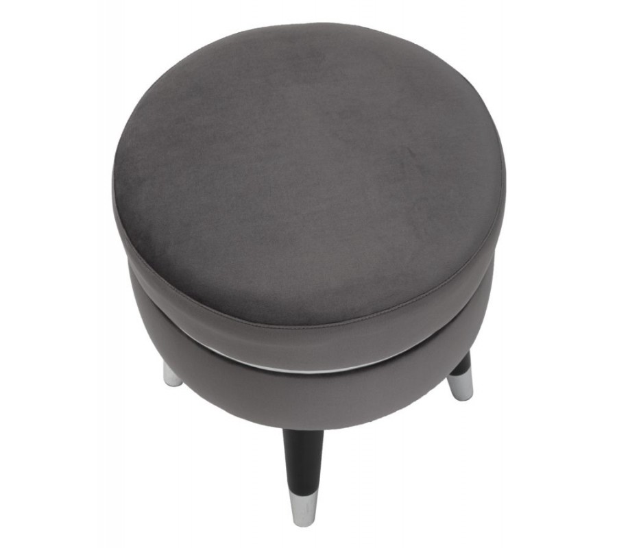 Okrúhla taburetka Laurentia v art deco a glamour štýle v sebe spája eleganciu a funkčnosť. Čalúnená so zamatovým poťahom v tmavej sivej farbe, pôsobí sofistikovane a luxusne.