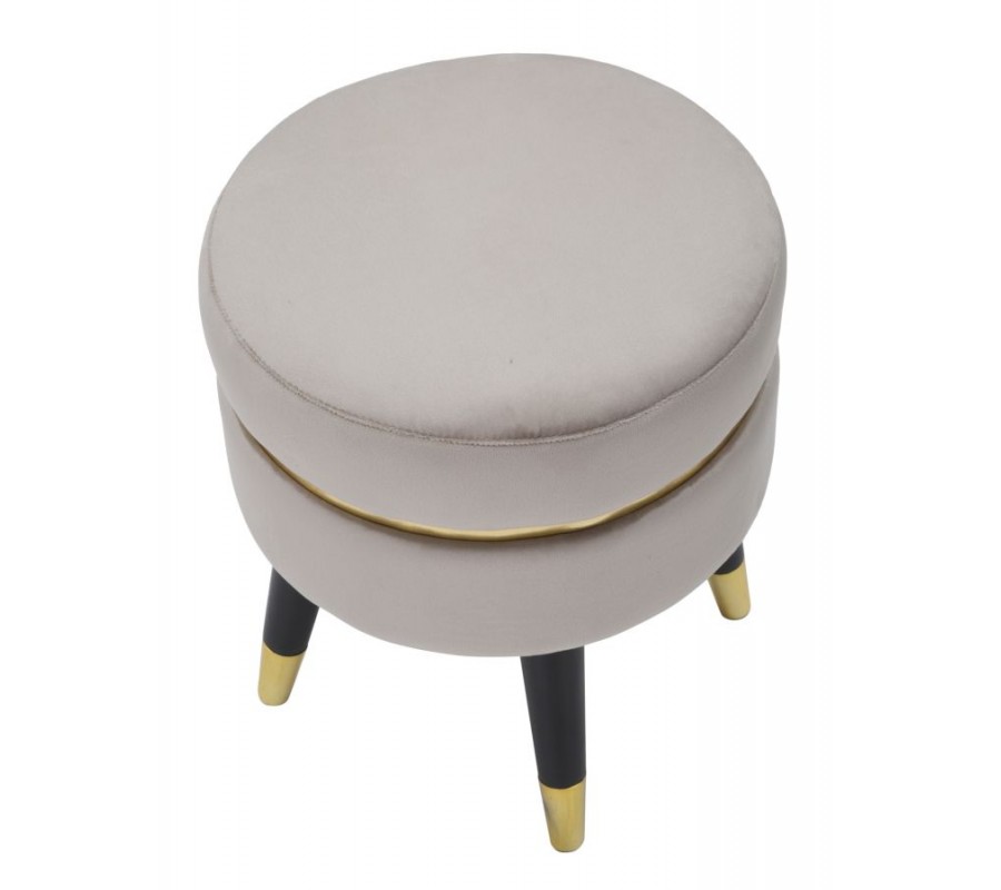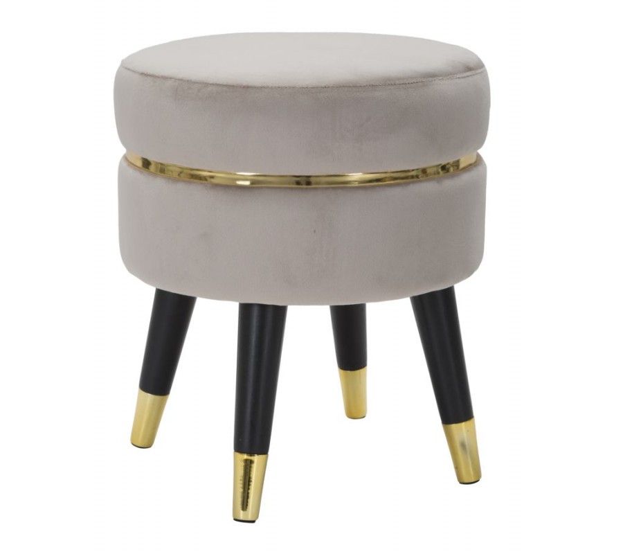 Art deco okrúhla čalúnená taburetka Laurentia so zamatovým sivým poťahom a čiernymi nožičkami so zlatými detailmi 40 cm