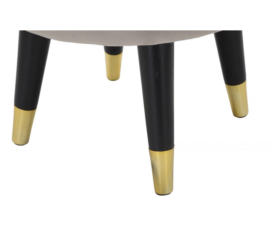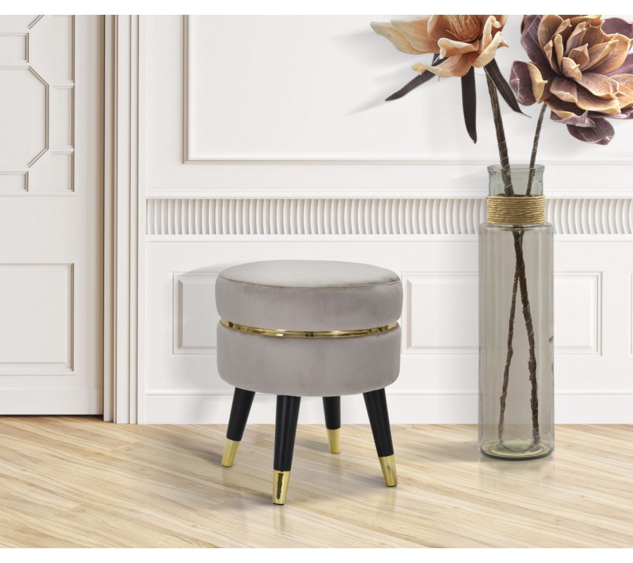 Luxusný nádych podčiarkujú zlaté detaily, ktoré sa nachádzajú po obvode taburetky a na koncoch jej štyroch čiernych nožičiek. Táto kombinácia vytvára atraktívny kontrast medzi svetlým čalúnením a tmavými nohami.