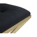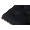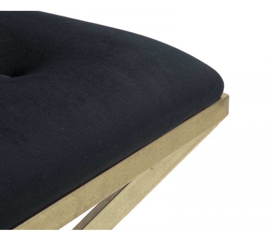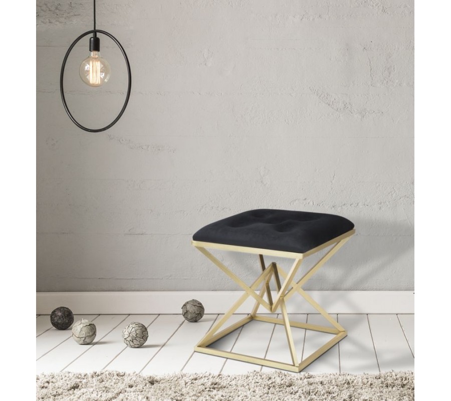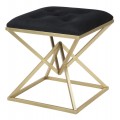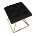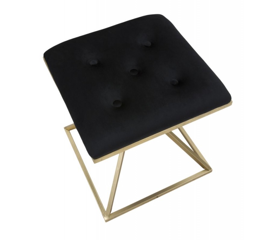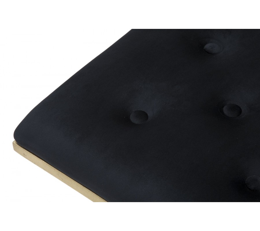 Taburetka má sedadlo štvorcového tvaru s penovým čalúnením, ktoré zaručí pohodlné sedenie. Je potiahnuté zamatovou textíliou v čiernej farbe, ktorá vytvára sofistikovaný farebný akcent. Sedadlo zdobí prešívanie so štyrmi okrúhlymi gombíkmi, pripomínajúce luxusný chesterfield nábytok.