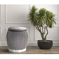 Taburetka je vyrobená z dreva a pokrytá penovým čalúnením. Povrch zdobí poťah zo zamatovej látky v elegantnej sivej farbe. Jeho jemný lesk výborne korešponduje s metalickým strieborným lemovaním podstavy, ktorý prináša do dizajnu glamour nádych.