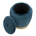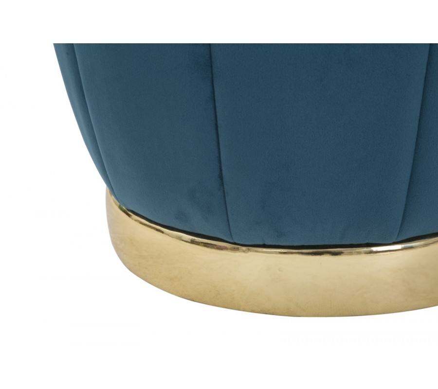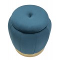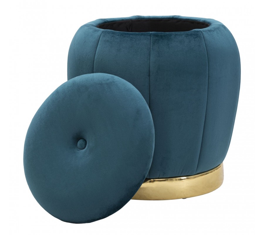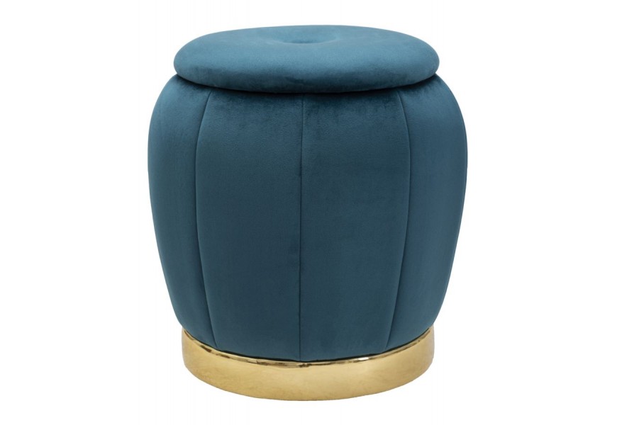 Dizajnová art deco okrúhla zamatová taburetka Zucca s úložným priestorom v tealovej modrej farbe so zlatou podstavou 43 cm