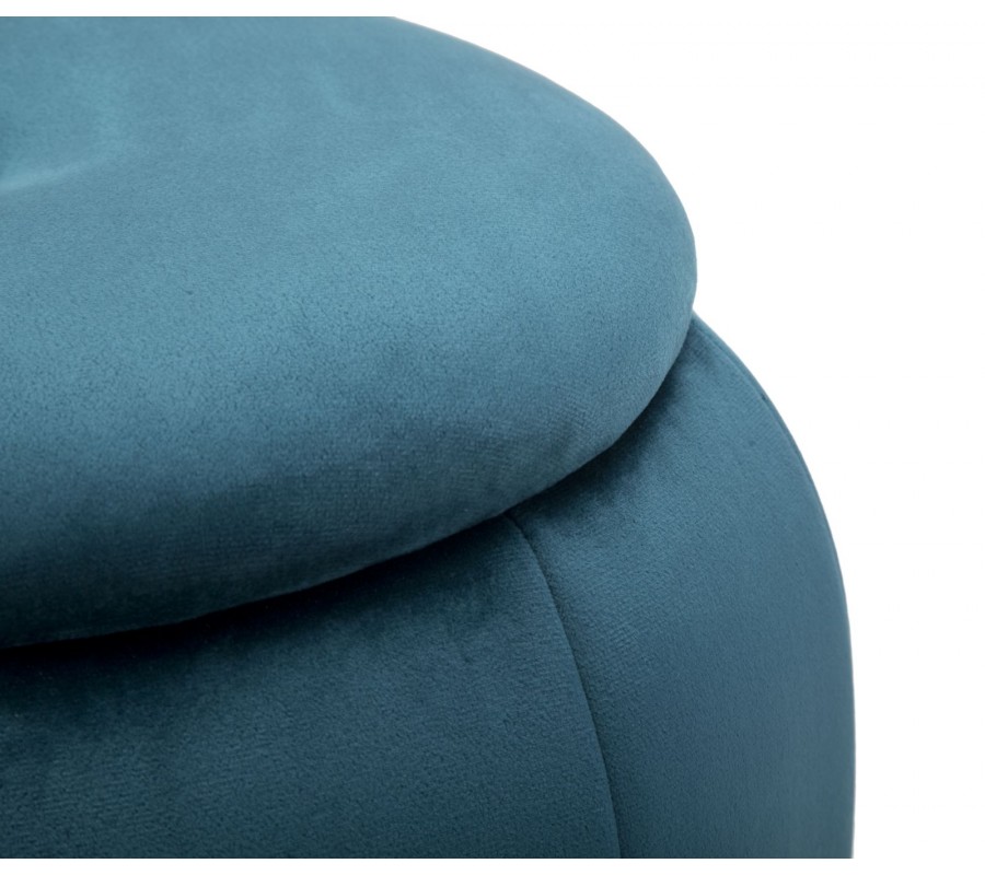 Taburetka má okrúhly tvar, ktorý sa smerom dole jemne zužuje. V kombinácii so zvislým prešívaním vzniká pôvabný tekvicový tvar. Vo vrchnej časti sa nachádza odnímateľné veko, ktoré zdobí okrúhly dekoračný gombík v strede. Podstava má kovové lemovanie v zlatej farbe, ktoré vytvára estetický kontrast k tealovej farbe poťahu.