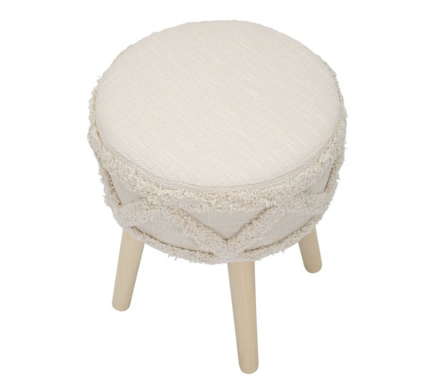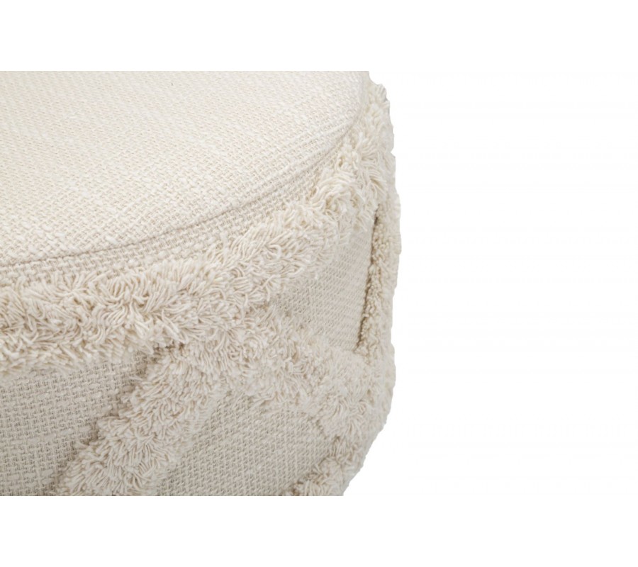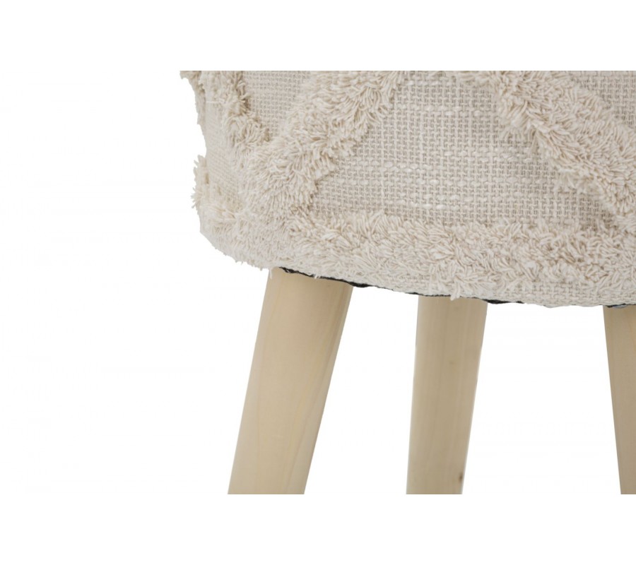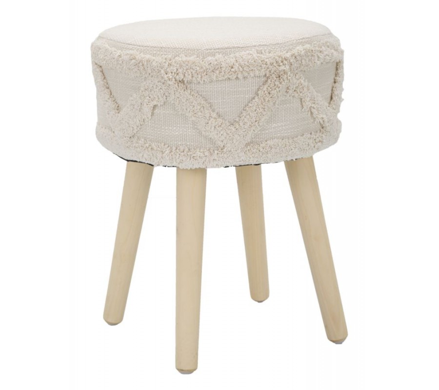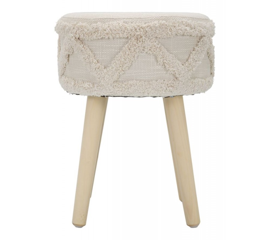 Textilný poťah taburetky je zdobený reliéfnymi geometrickými vzormi vytvorenými tuftovanou technikou, ktoré dodávajú povrchu výraznú štruktúru a príjemný hmatový efekt. Poťah je vyrobený zo zmesi bavlny a syntetických vlákien, vďaka čomu je príjemný na dotyk a zároveň odolný.