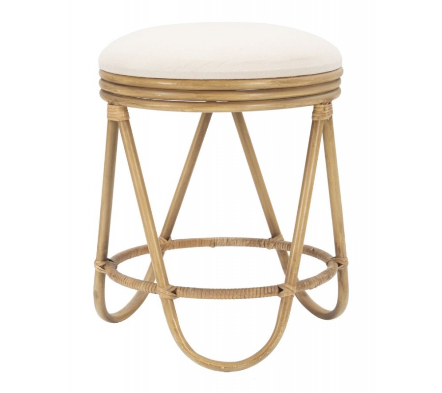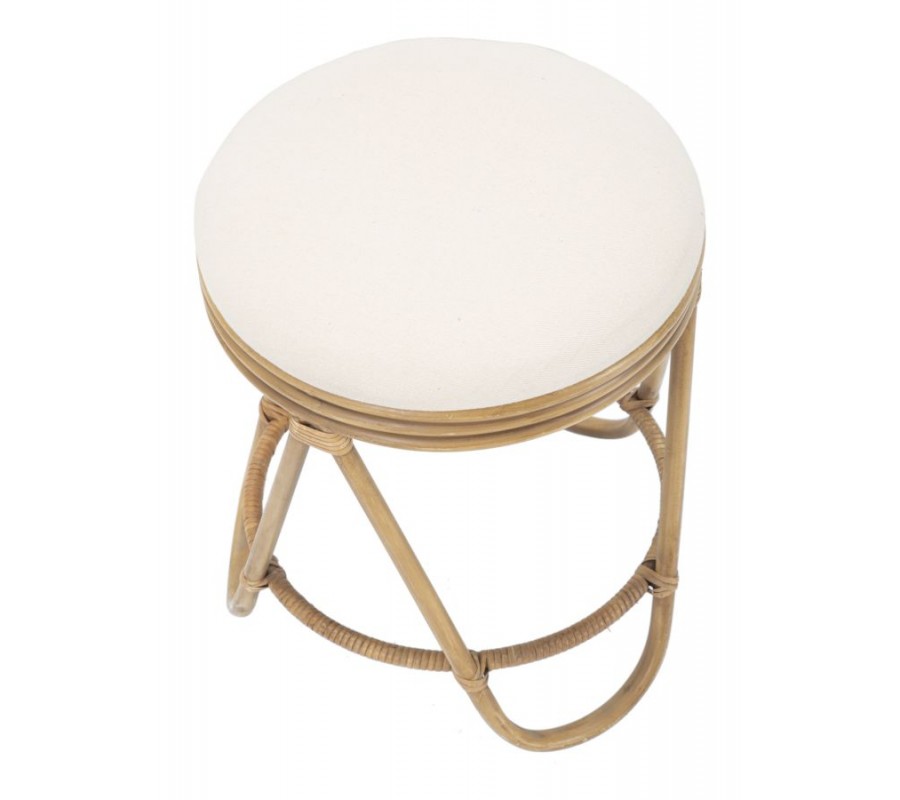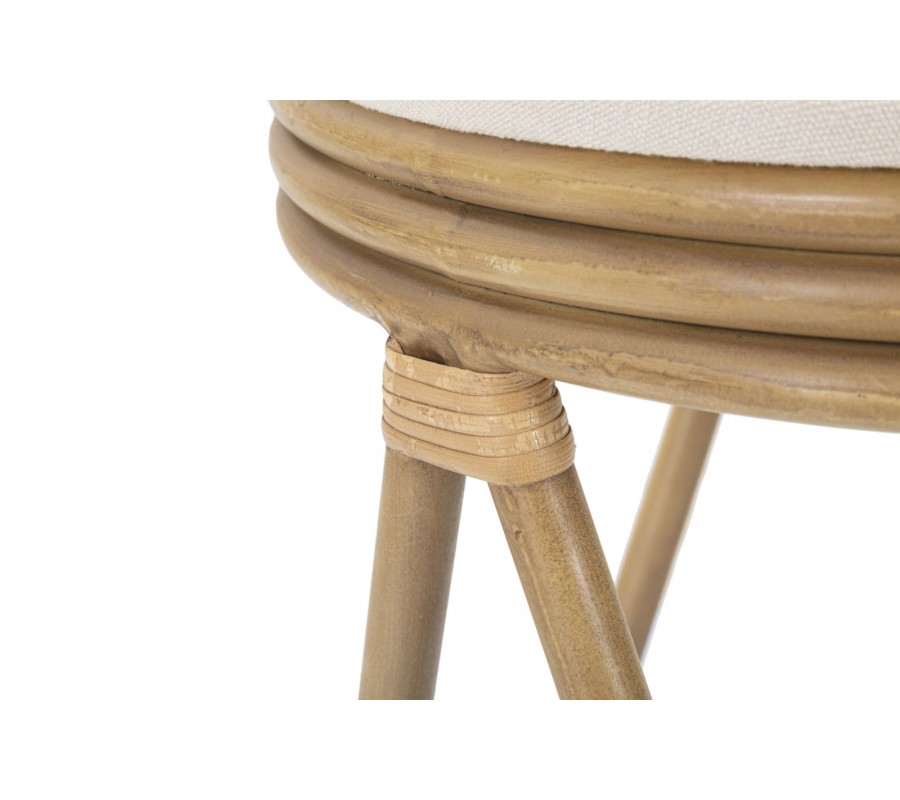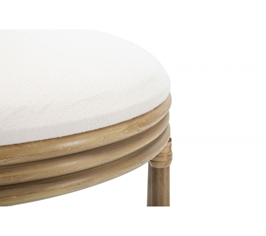 Taburetka Lania v etno štýle kombinuje prírodné materiály a elegantný dizajn. Má okrúhly tvar a jej sedacia časť je čalúnená mäkkým textilným poťahom v bielej farbe, čo zaisťuje pohodlné sedenie a príjemný vizuálny kontrast s ratanovou konštrukciou.