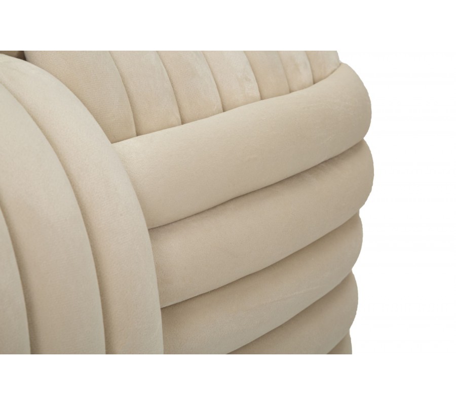 Povrch je potiahnutý zamatovým poťahom, ktorý jej dodáva jemnosť, hebkosť a luxusný vzhľad. Čalúnenie je tvorené mäkkými, oblými valcami, ktoré sú usporiadané vodorovne aj zvisle a plynulo na seba nadväzujú, čím vytvárajú charakteristický dizajn. Bočné časti sú zaoblené a pôsobia mohutne, čím podporujú dojem útulnosti a pohodlia. Vrchná časť je mierne vypuklá.