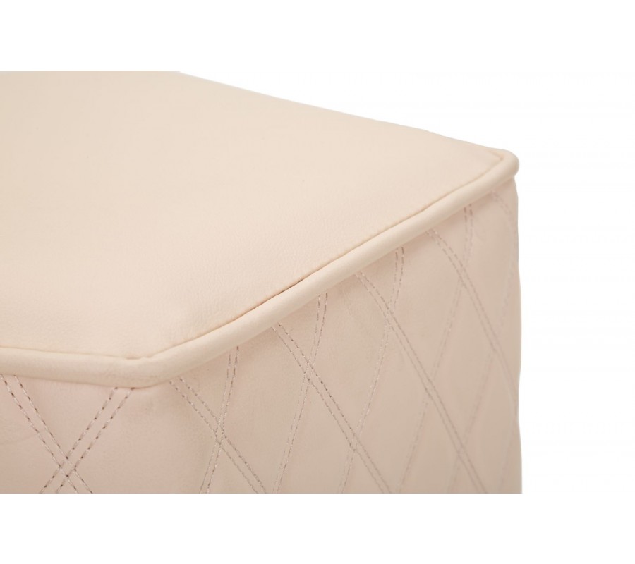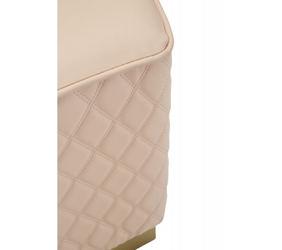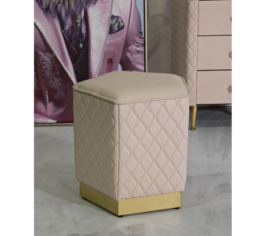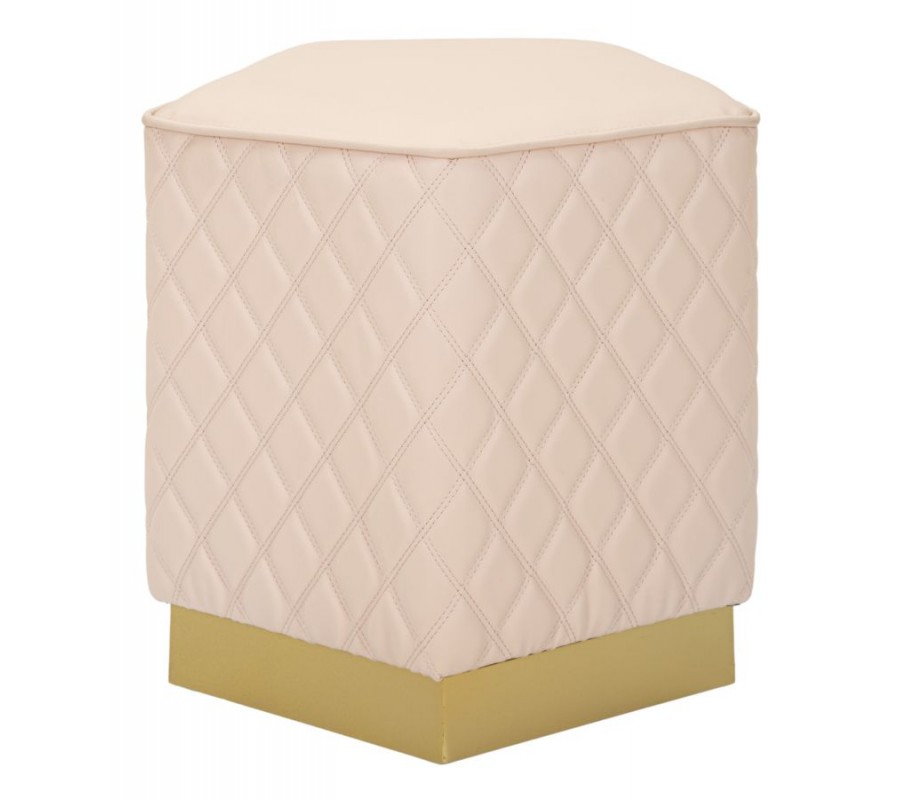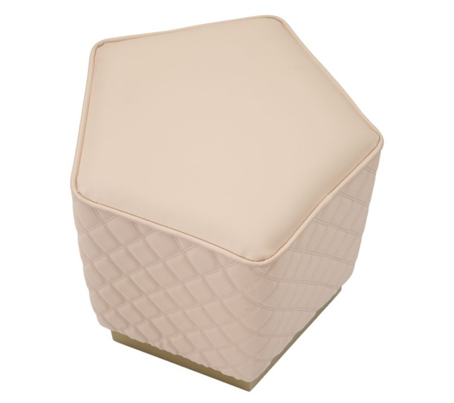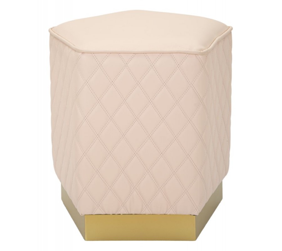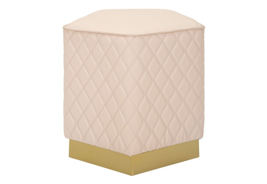 Art deco taburetka Glamia Tapisé s eko koženým poťahom v päťuholníkovom tvare zaujme svojím netradičným geometrickým dizajnom a jemným ružovým čalúnením. Povrch zdobí prešívaný diamantový vzor, ktorý dodáva taburetke elegantný vzhľad a zdôrazňuje jej luxusný charakter.