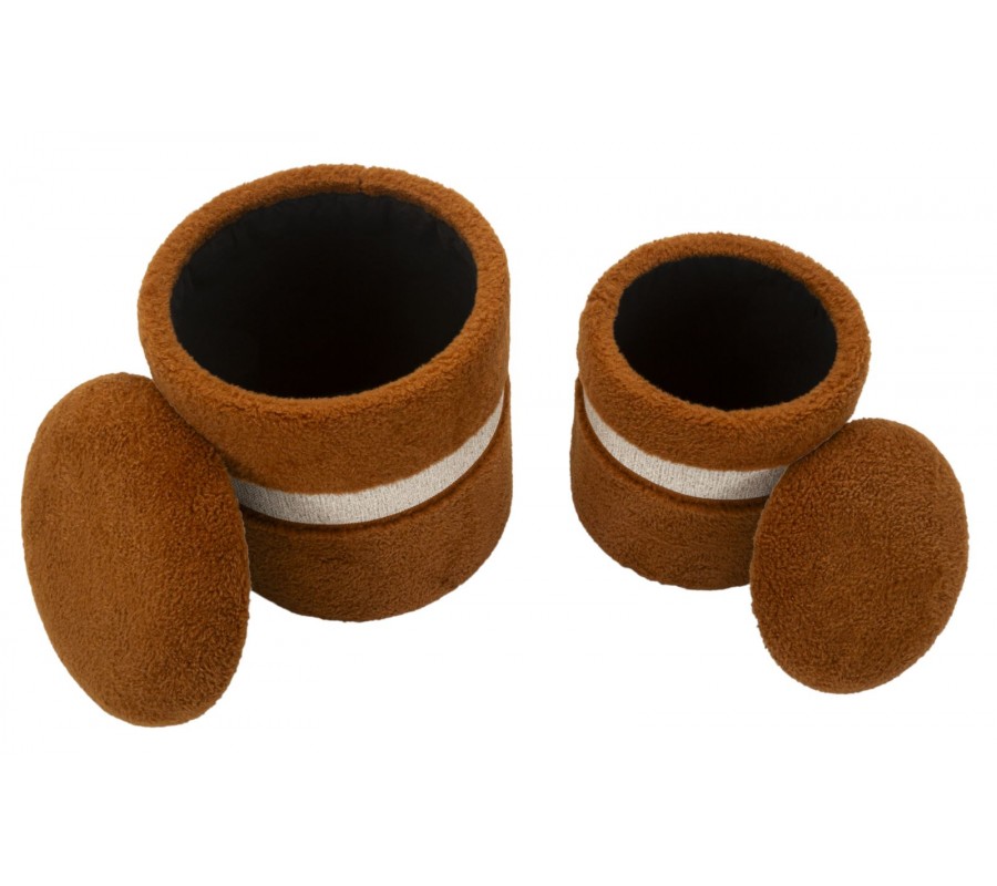 Dizajnová sada dvoch taburetiek Mendy v okrúhlom tvare s úložným priestorom a odnímateľným sedákom ponúka praktické aj estetické riešenie do moderného interiéru. Čalúnenie v teplej hnedej farbe dodáva eleganciu, zatiaľ čo sivý dekoračný pás vytvára jemný kontrast a vizuálne rozčleňuje konštrukciu. Vnútorný priestor taburetiek je v čiernej farbe, čo podčiarkuje ich sofistikovaný vzhľad. Rozmery väčšej taburetky sú 40 cm priemer a výška 47 cm, a menšej 32 cm je priemer a 38 cm výška.