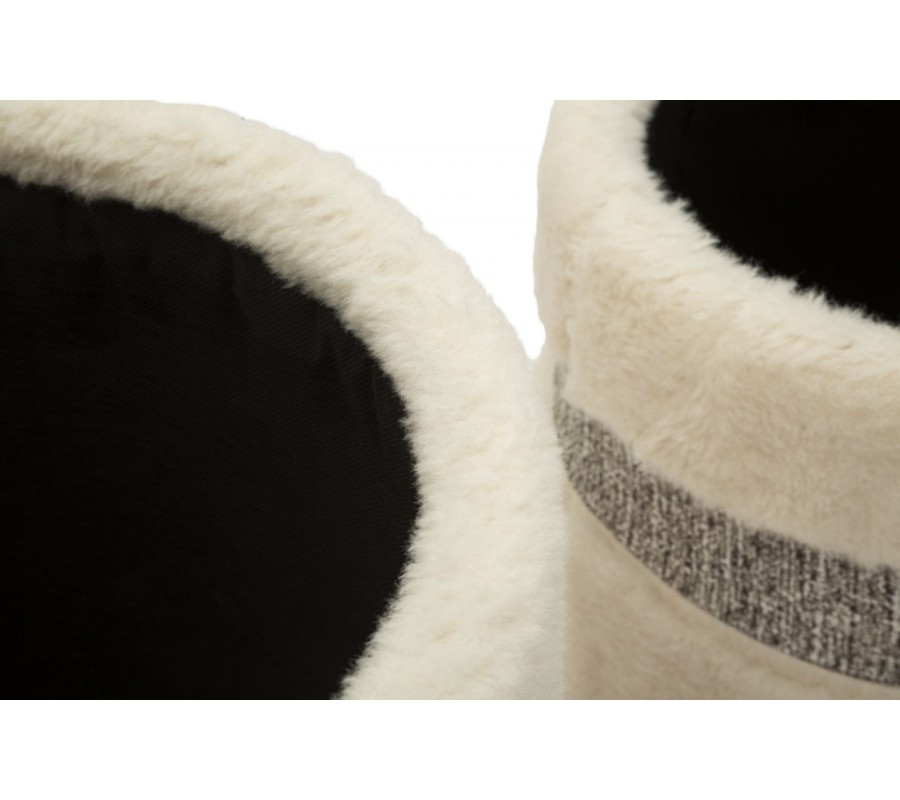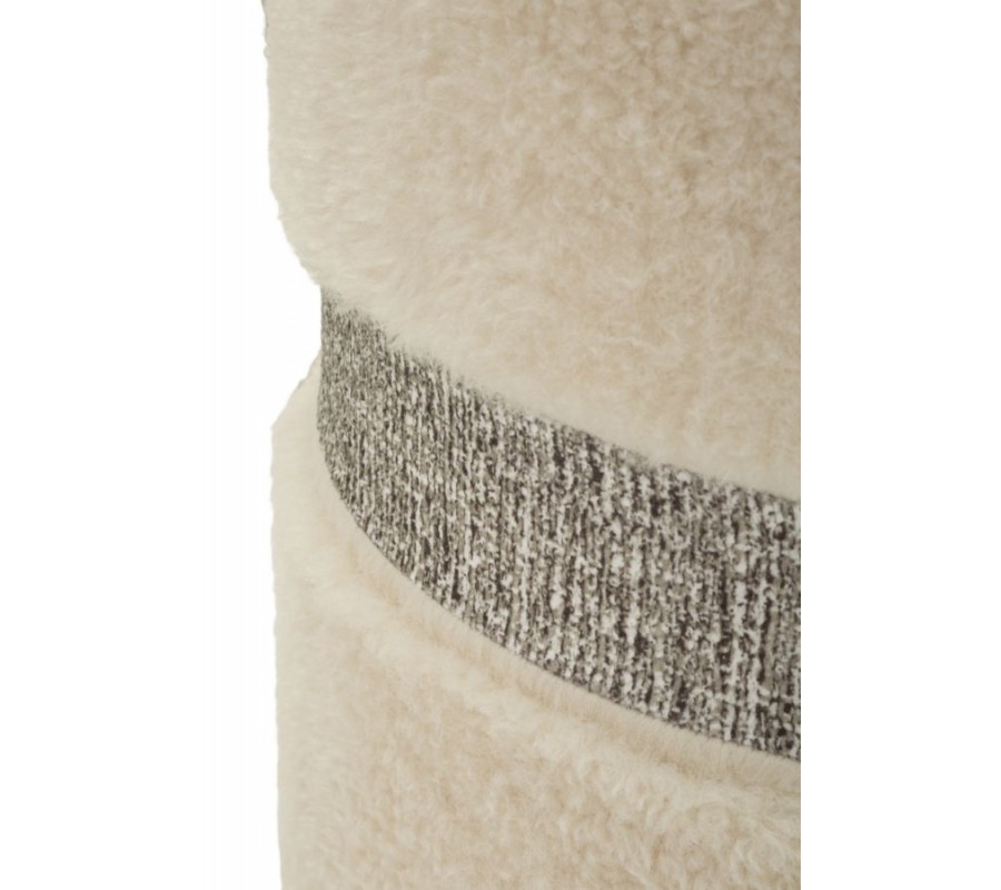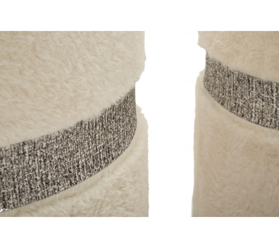 Dizajnová sada dvoch taburetiek Mendy v okrúhlom tvare ponúka kombináciu elegancie a praktického využitia v modernom interiéri. Taburetky sú čalúnené s huňatým poťahom v krémovej farbe, ktorá pôsobí čisto a nadčasovo, pričom ich dizajn oživuje sivý dekoračný pás s jemnou textúrou. Tento detail pridáva taburetkám sofistikovaný vzhľad a zaujímavú vizuálnu štruktúru.