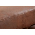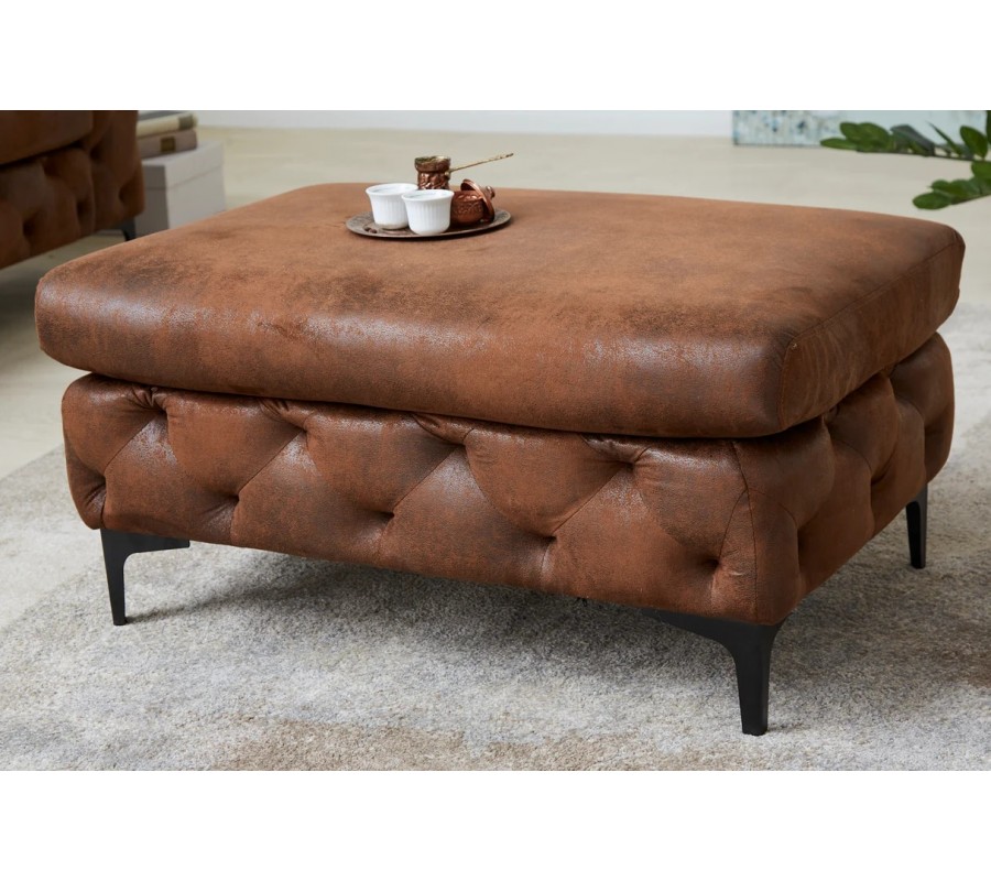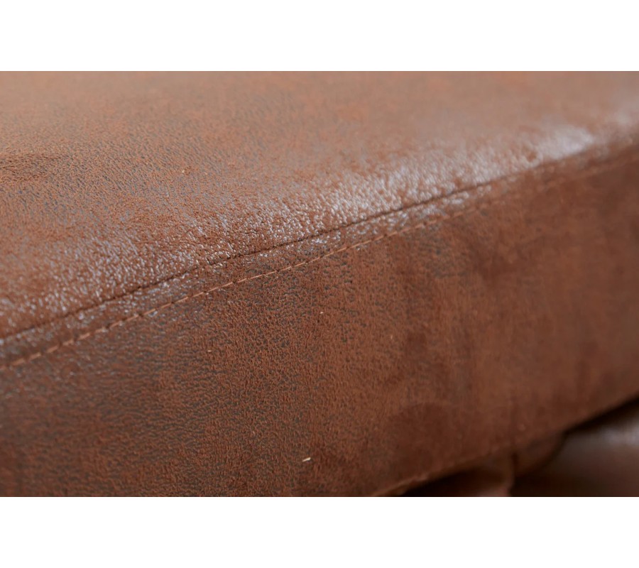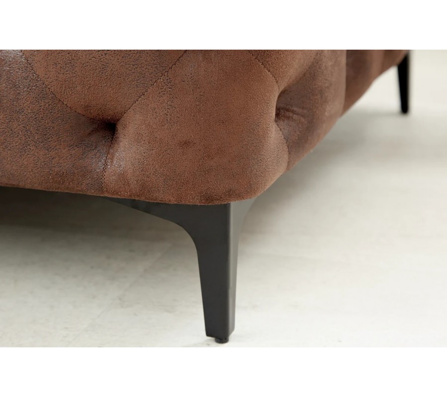 Poťah z eko kože v hnedohnedom odtieni má jemne patinovaný vzhľad a matný povrch s nádychom vintage estetiky. V spodnej časti taburetky sa nachádza typické chesterfield prešívanie, ktoré vytvára pravidelný kosoštvorcový vzor s hlbokými vtiahnutiami. Vďaka výraznému polstrovaniu má povrch plastickú štruktúru, ktorá nielen lahodí oku, ale aj zvyšuje komfort.