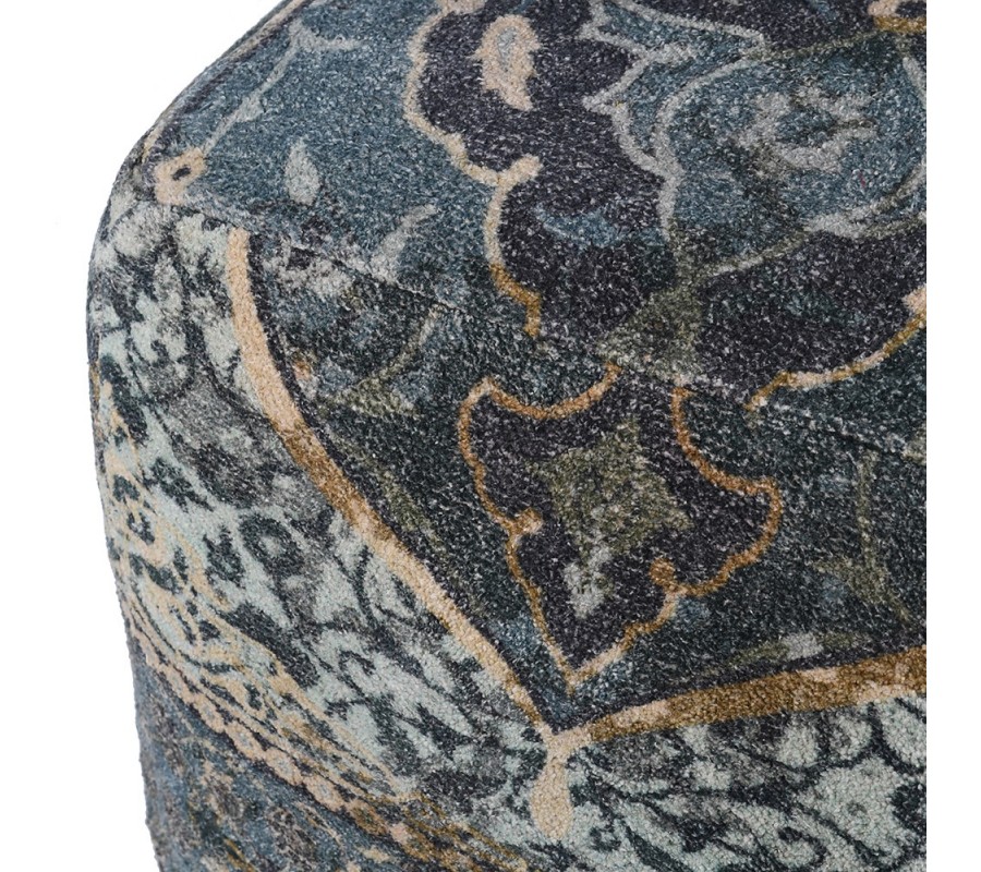 Farebné prevedenie v tmavomodrom odtieni je doplnené o ornamentálne detaily v odtieňoch béžovej, horčicovej a čiernej, ktoré vytvárajú efekt vrstvenia a vintage patiny. Textilný povrch je na dotyk príjemný a zároveň opticky hrejivý, čo robí z tejto taburetky nielen praktický, ale aj dekoratívny doplnok.