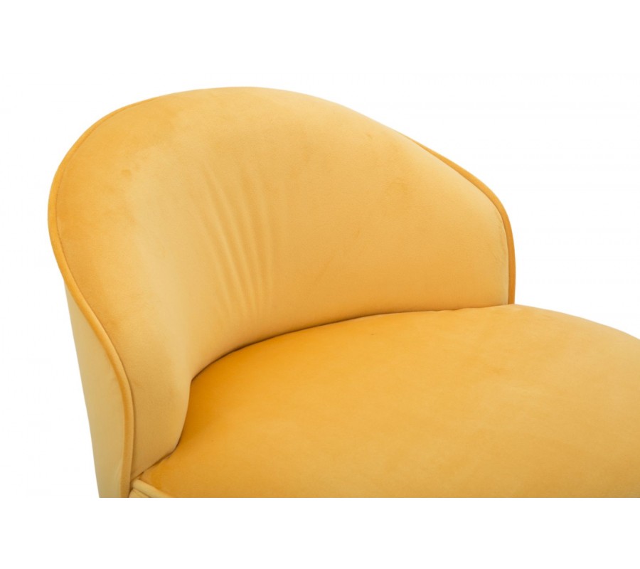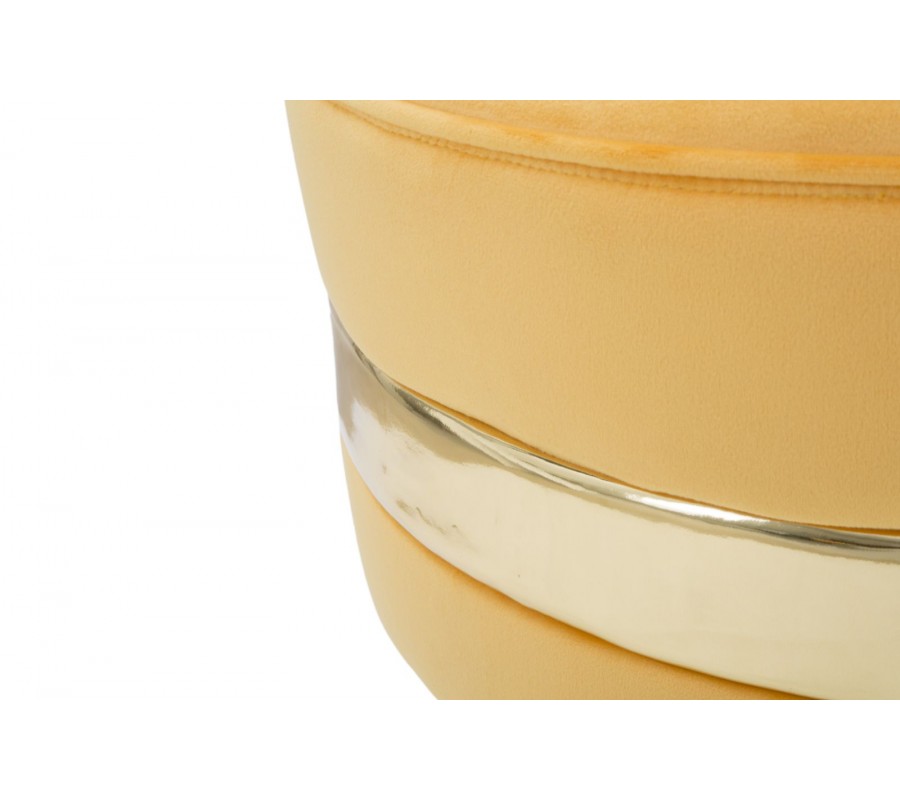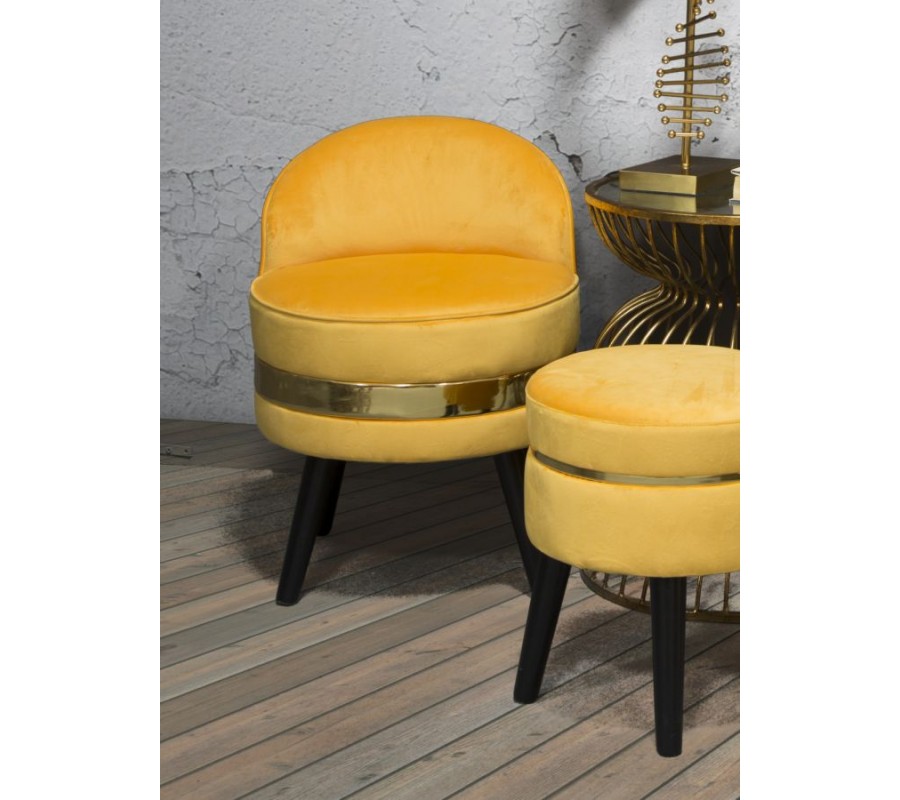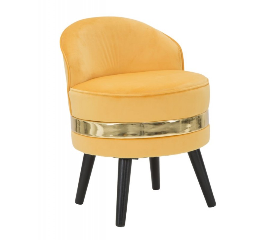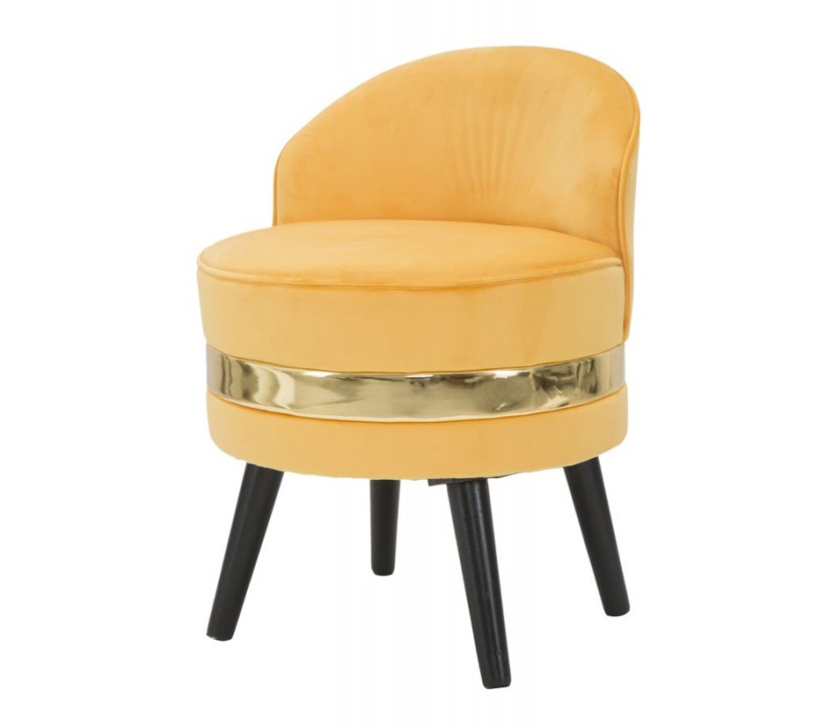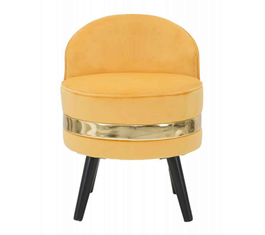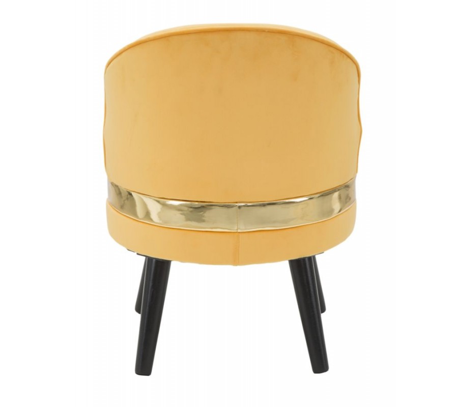 Žiarivú žltú farbu poťahu výborne dopĺňa horizontálny pás, obopínajúci spodnú časť sedadla. Zlatá farba zdôrazňuje glamour charakter nábytku a krásne korešponduje s jemným leskom zamatu. Drevené nožičky sú vyhotovené v kontrastnom čiernom prevedení. Majú valcovitý tvar, ktorý je v spodnej časti zúžený a ich zošikmená línia je typická pre art deco štýl.