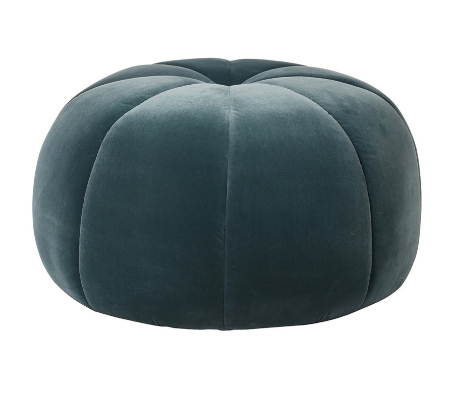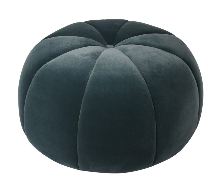 Taburetka má okrúhly tvar bez nožičiek. V strede vrchnej časti je umiestnený jeden okrúhly gombík, z ktorého vychádza do strán symetrické vertikálne prešívanie. Tento hravý dizajn pripomína tekvicu, zatiaľ čo krásna modrozelená farba poťahu pôsobí moderným dojmom.