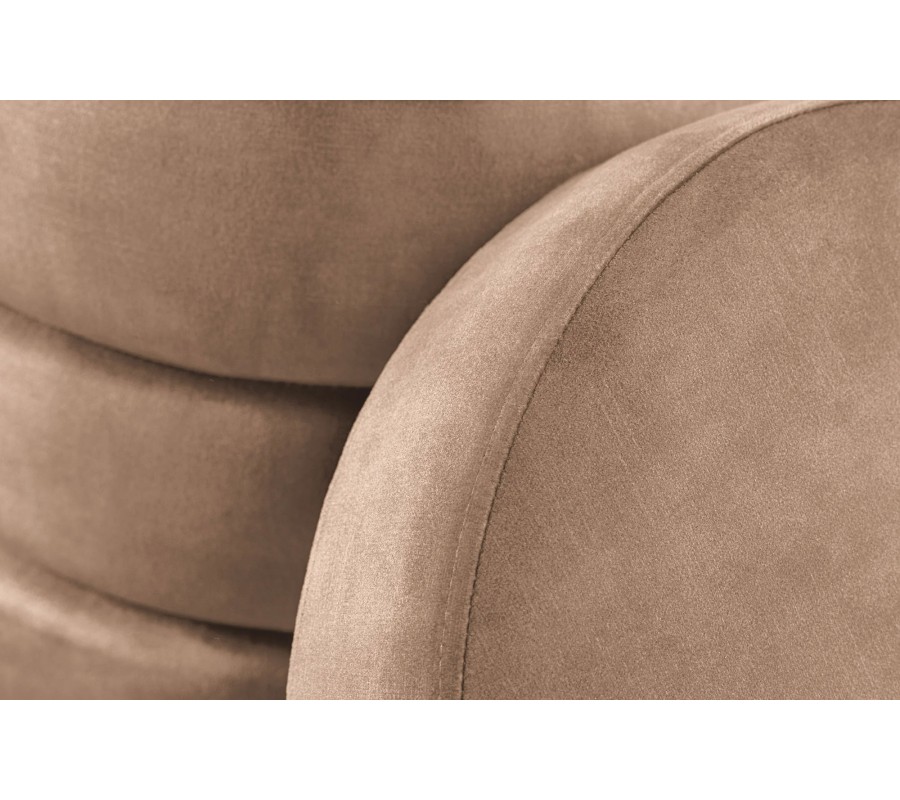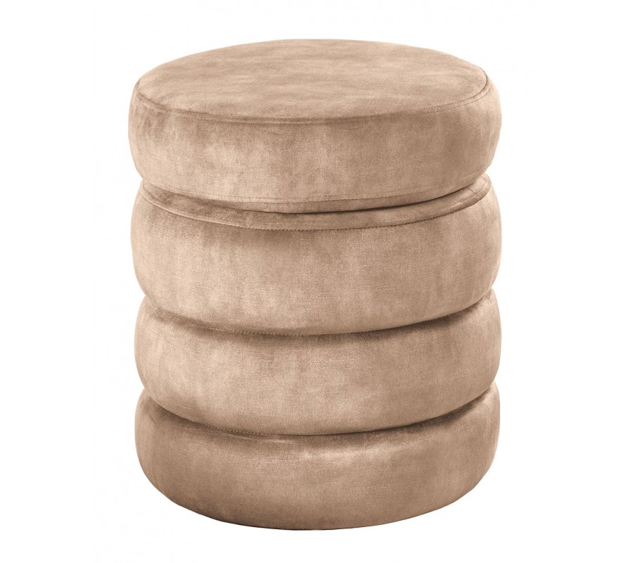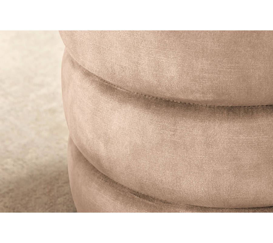 Taburetka Eliana zaujme moderným prevedením a nápaditým dizajnom. Jej okrúly tvar dopĺňa originálna vrstvená štruktúra, ktorá vytvára dojem štyroch mäkkých čalúnených pásov položených na seba. Povrch tvorí jemná zamatová látka v elegantnej šampanskej béžovej farbe, ktorá pôsobí teplo, luxusne a zároveň moderne.