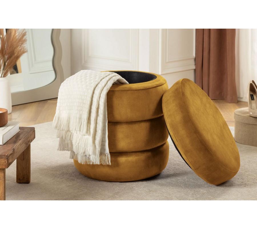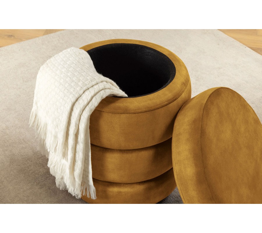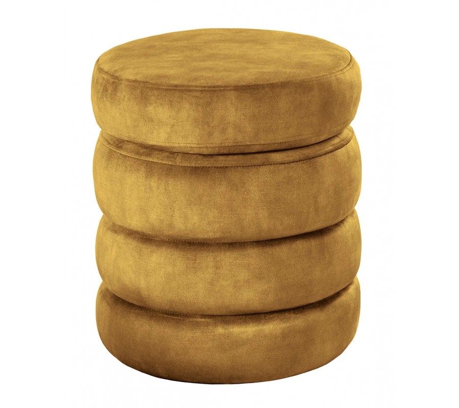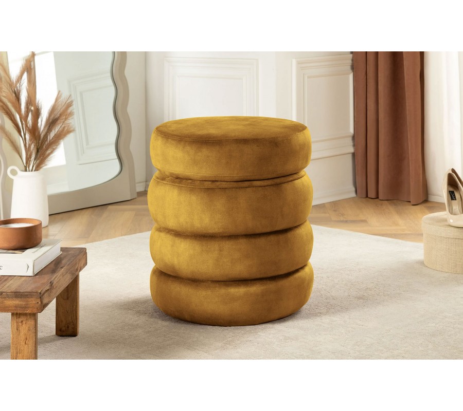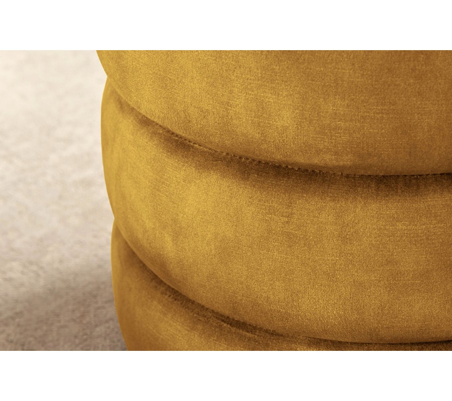 Moderná okrúhla taburetka Eliana s úložným priestorom a zamatovým horčicovo žltým poťahom s vrstveným dizajnom 49 cm