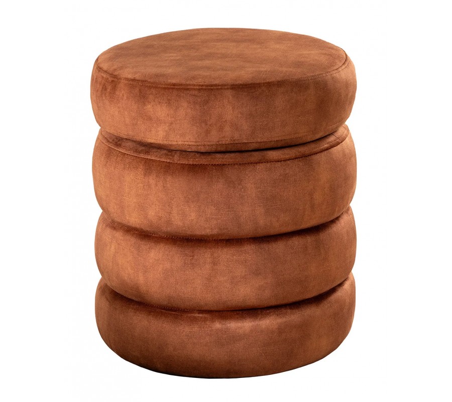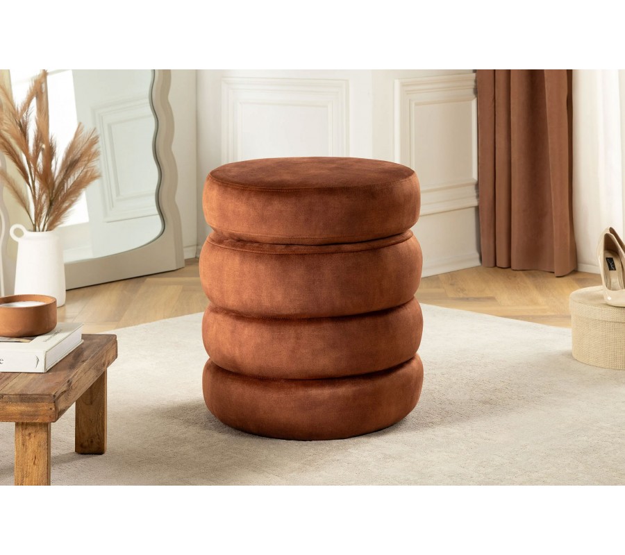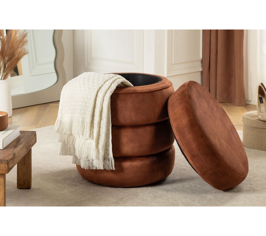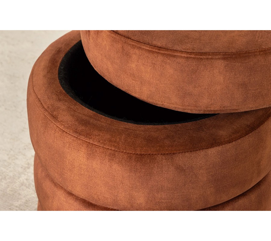Dizajnová zamatová prešívaná taburetka Eliana okrúhleho tvaru s hrdzavo hnedým poťahom a úložným priestorom 49 cm