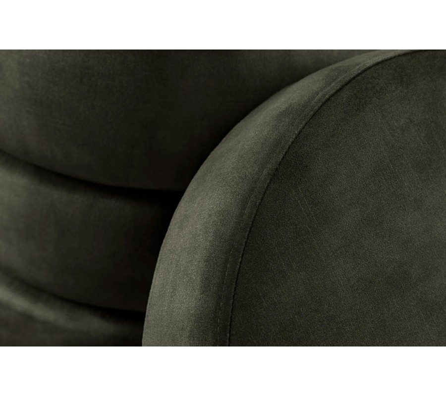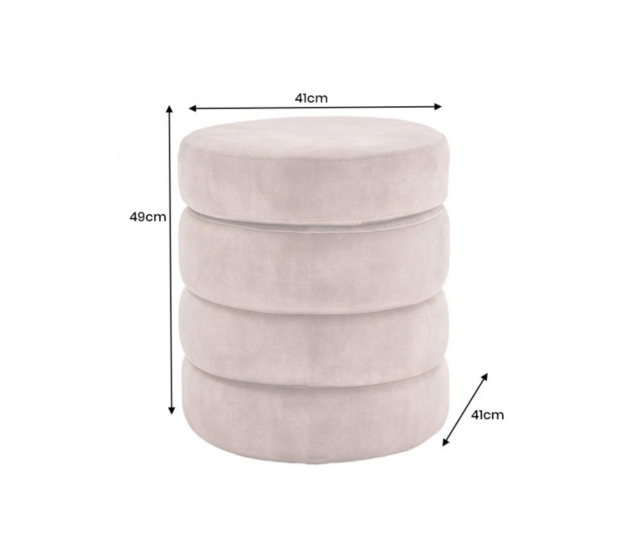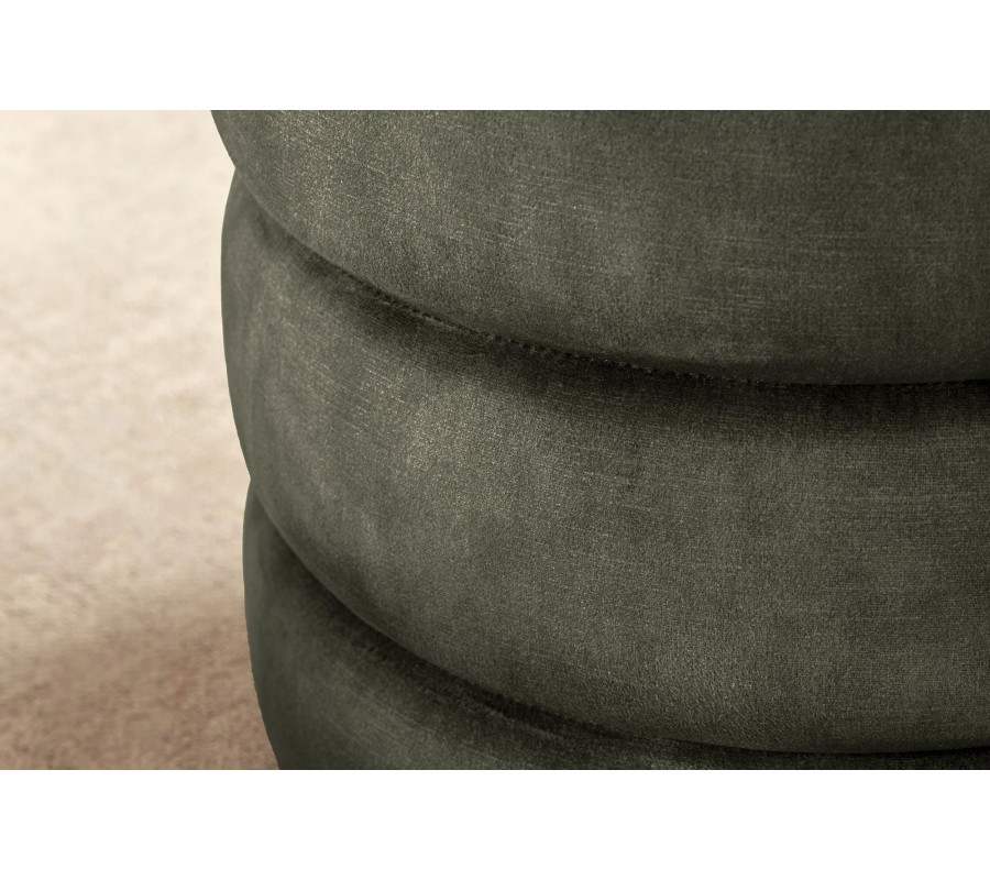Taburetka má okrúhly pôdorys a valcovitý tvar. Konštrukciu pokrýva penové čalúnenie a poťah z mikrovlákna so zamatovým finišom, ktorý je príjemný na dotyk a zároveň tiež pevný a odolný. Elegantné prevedenie v zelenosivom kaki odtieni pôsobí sofistikovaným dojmom a zároveň prinesie do priestoru svieži akcent.