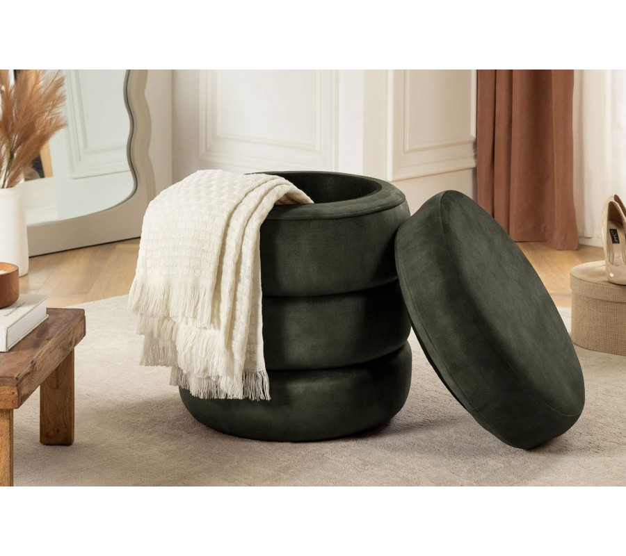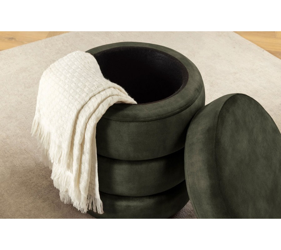 Moderná okrúhla zamatová taburetka Eliana s tmavozeleným kaki prešívaným poťahom a úložným priestorom 49 cm
