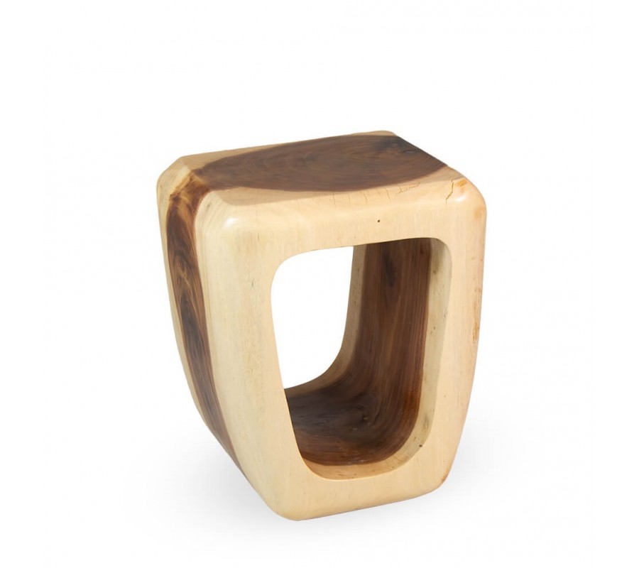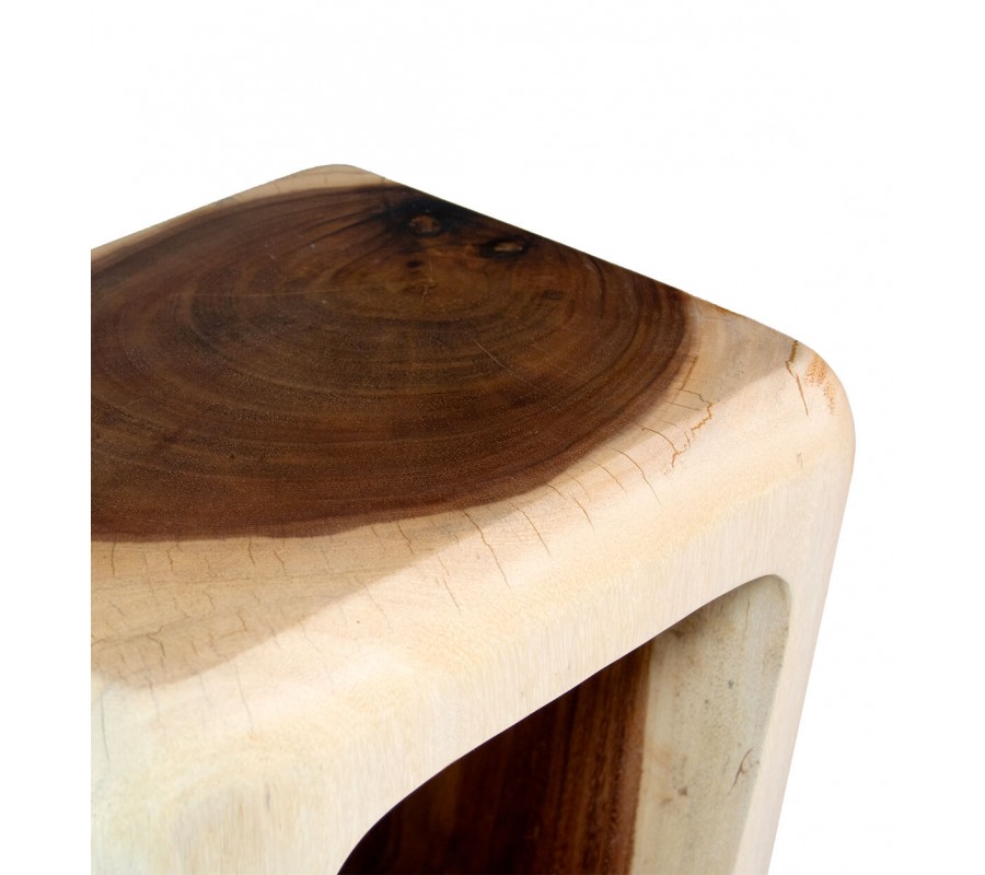 Taburetka je vyrezávaná zo suarového masívu a pri svojom dizajne naplno zúročuje prirodzenú farebnosť tohto exotického dreva, s tmavým hnedým jadrom a kontrastnými béžovo-hnedými vonkajšími vrstvami. Na povrchu sú tiež viditeľné prirodzené štruktúry, uzly a praskliny, ktoré dodávajú každému kusu unikátnosť a zvyšujú jeho estetickú hodnotu.
