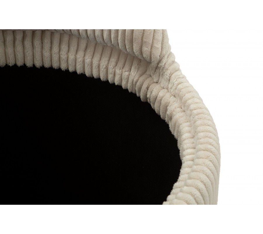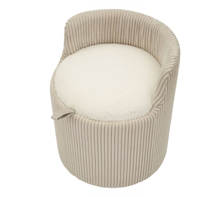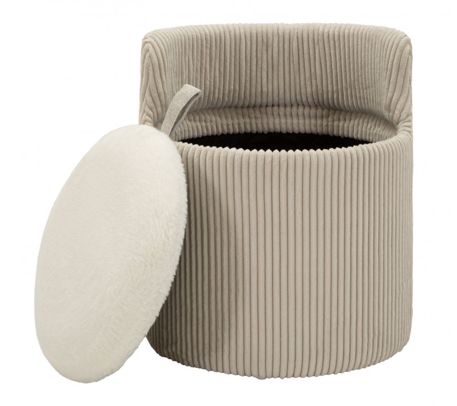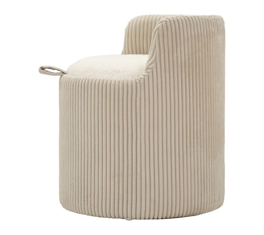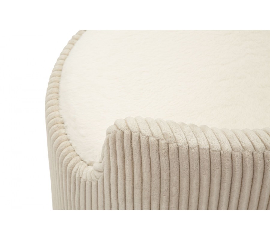Taburetka má mohutnú valcovitú siluetu bez nožičiek. Pevnú drevenú konštrukciu pokrýva penové čalúnenie a poťah z mikrovlákna s plyšovým finišom. Textília je odolná voči vplyvom každodenného používania, vďaka vyššiemu vlasu je príjemná na dotyk a prinesie do priestoru teplo pôsobiaci prvok. Prevedenie vo svetlej béžovej farbe dizajn odľahčuje a dodáva mu charakteristický škandinávsky výraz.