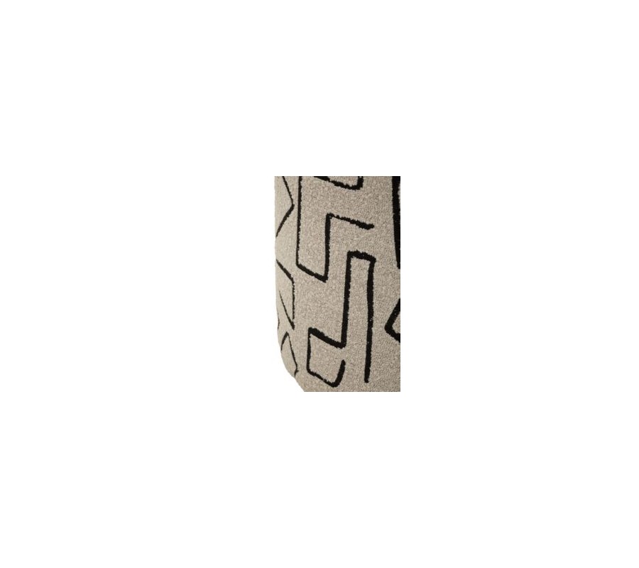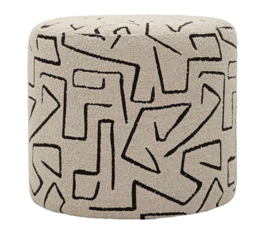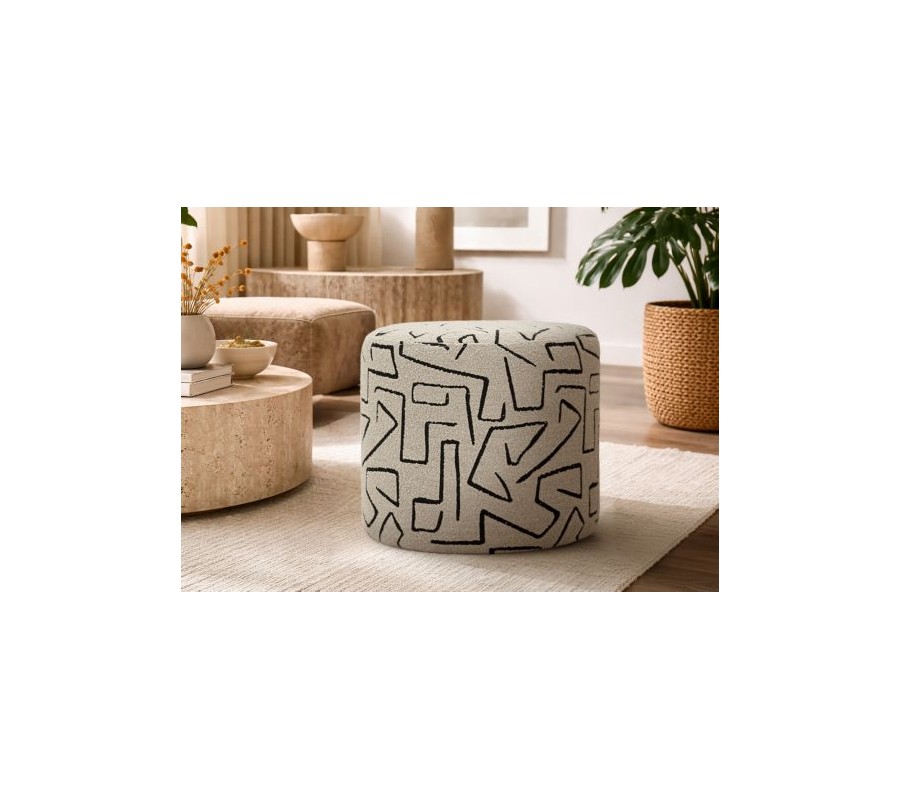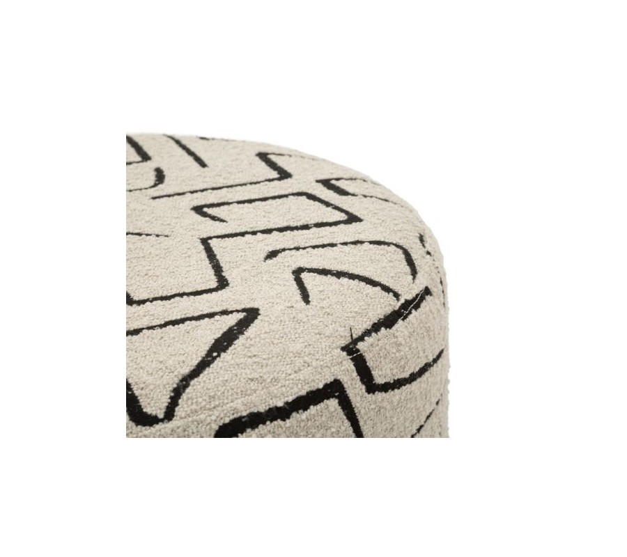 Okrúhla taburetka Terezja je výrazným dizajnovým doplnkom, ktorý do interiéru prináša moderný, umelecký charakter. Jej kompaktný valcovitý tvar bez nožičiek pôsobí minimalisticky a zároveň sochársky, vďaka čomu sa stáva zaujímavým akcentom v priestore. Béžovohnedý buklé poťah je doplnený kontrastným čiernym geometrickým vzorom, ktorý pripomína abstraktné línie a dodáva taburetke osobitú vizuálnu identitu.