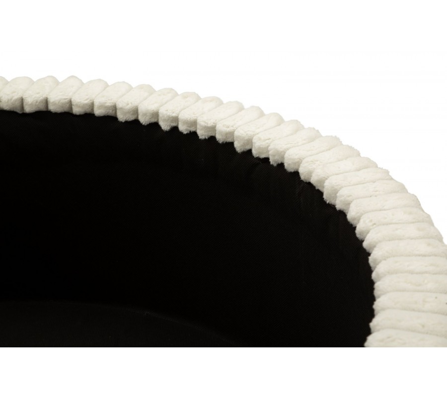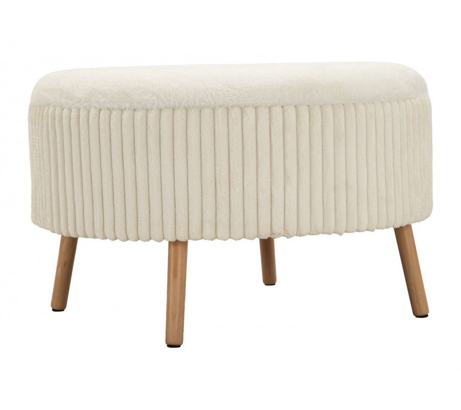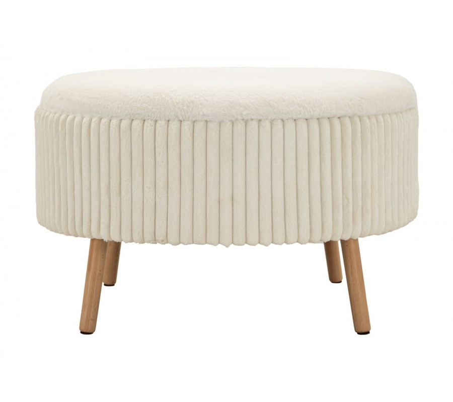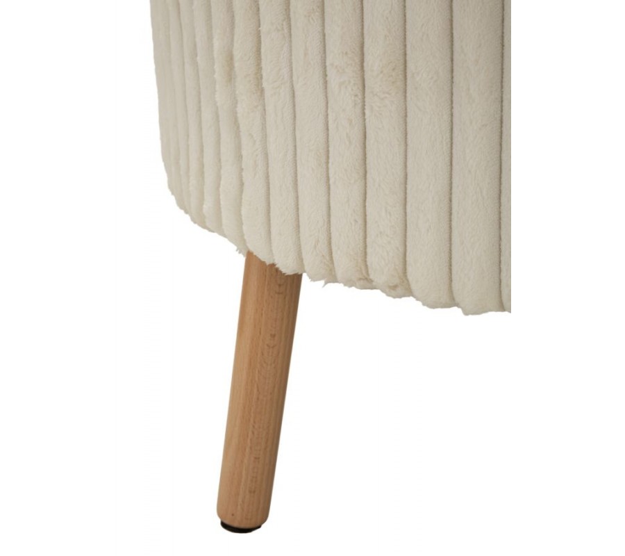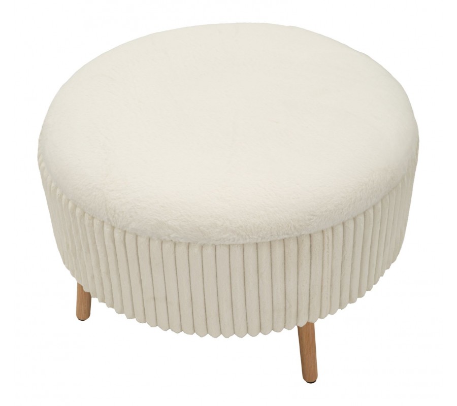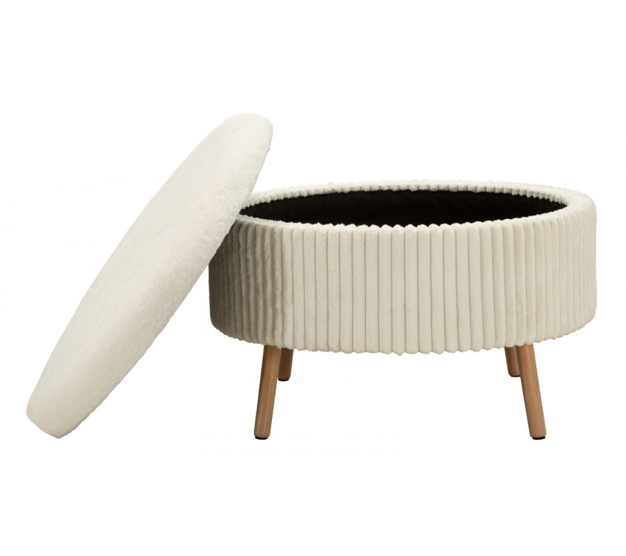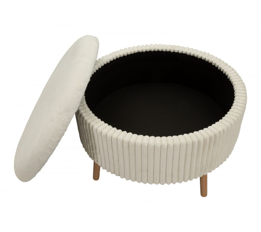 Taburetka je čalúnená príjemnou plyšovou textíliou s vrúbkovaným prešívaním po celom obvode, ktoré jej dodáva vizuálnu štruktúru a moderný charakter. Vrchná časť je úplne odnímateľná a pod ňou sa nachádza praktický úložný priestor s čiernym vnútrom, ideálny na uskladnenie diek, vankúšov, časopisov alebo drobností každodennej potreby.