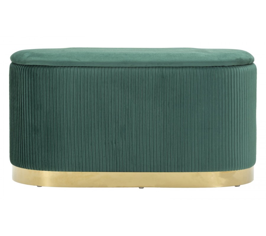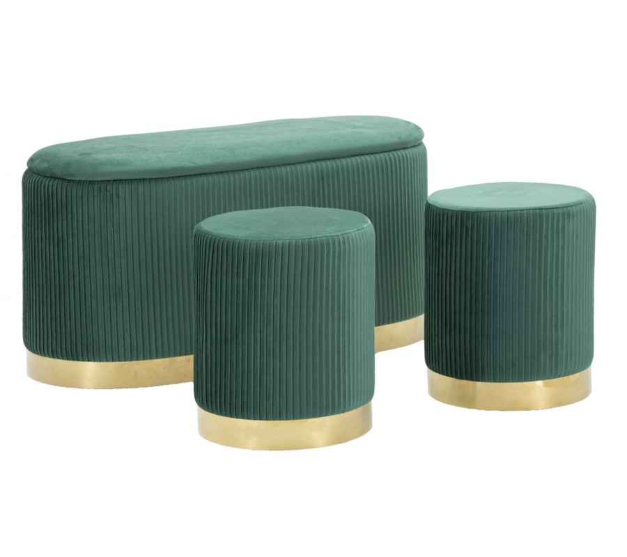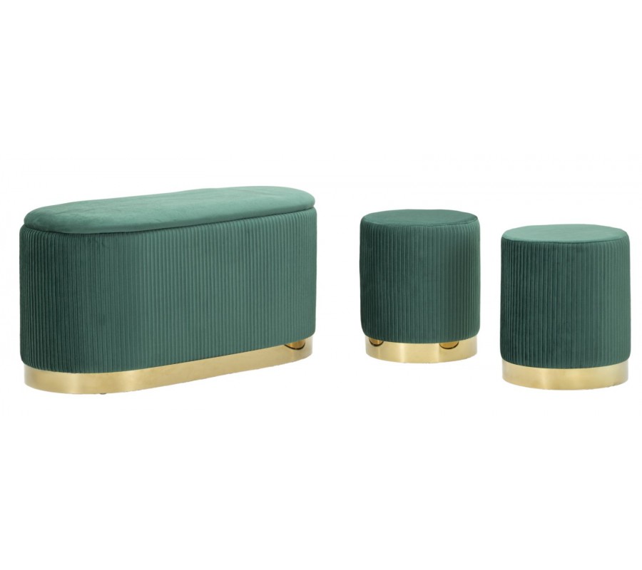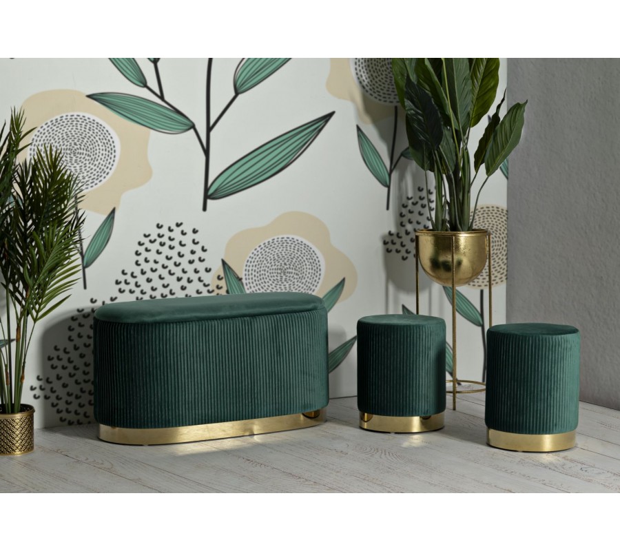 Sada taburetiek a lavice Ponzi prinesie do vašej obývačky či predsiene eleganciu art deco štýlu. Kombinácia krásnej zelenej farby s luxusným zlatým akcentom pôsobí sofistikovane a okrem štýlového vizuálu oceníte aj praktický odkladací priestor.
