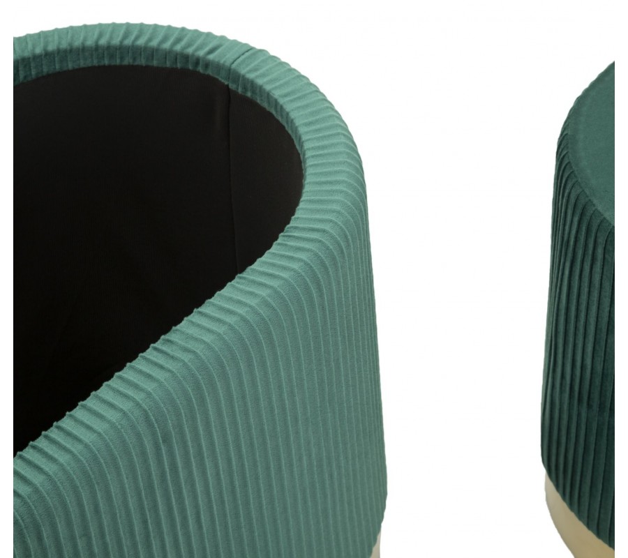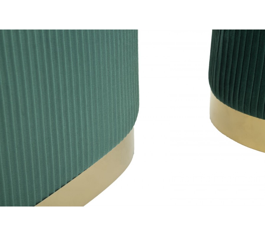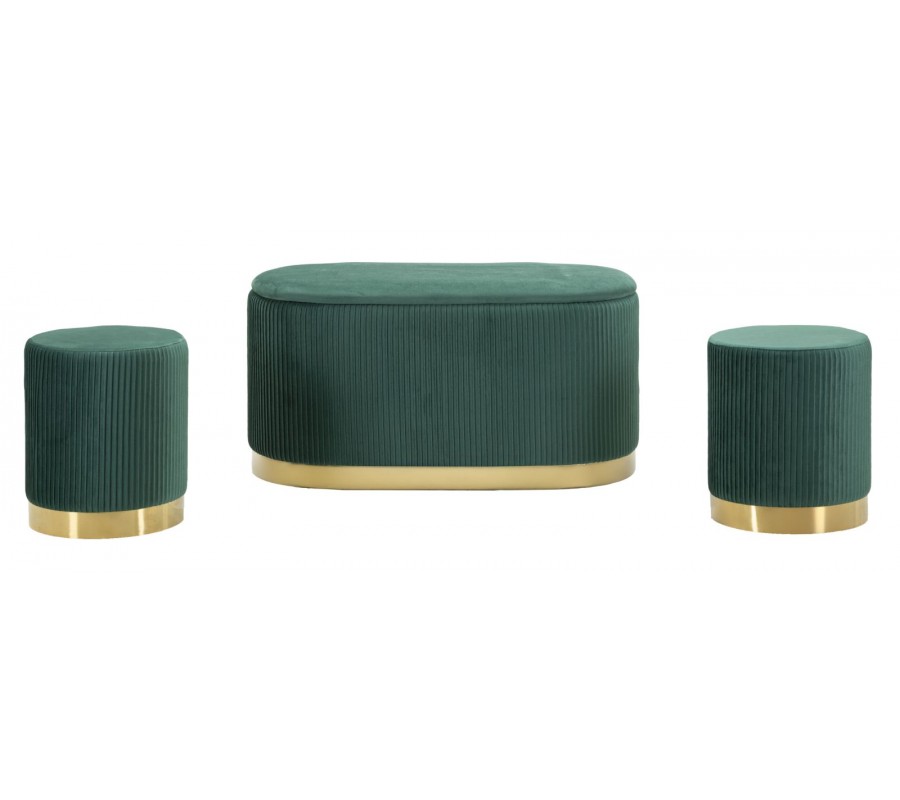 Dizajnová art deco sada Ponzi z dvoch taburetiek a oválnej lavice s úložným priestorom so zeleným čalúnením 80 cm