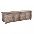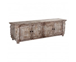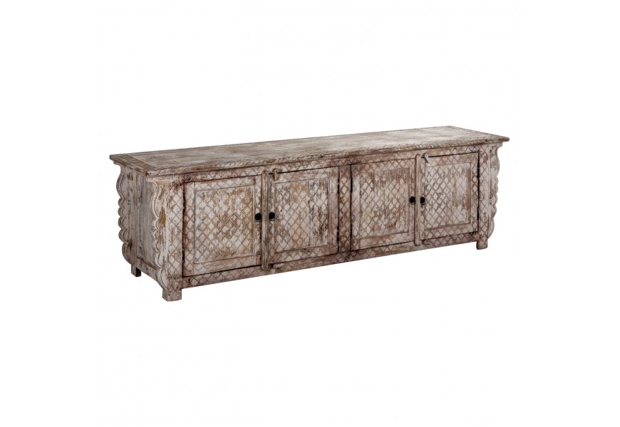 Vizuálne dôkladne opotrebovaný TV stolík vyrobený z masívneho mangového dreva.
