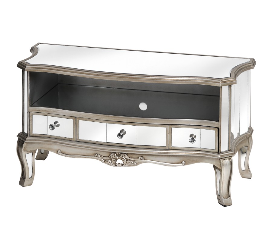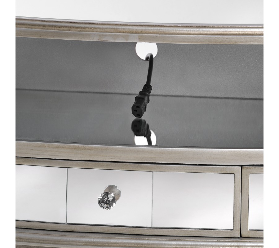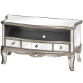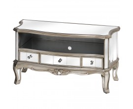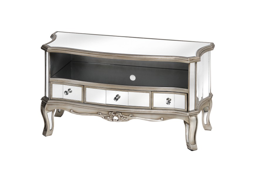 Elegantný zrkadlový TV stolík v striebornej farbe s tromi zásuvkami bude neprehliadnuteľným prvkom vášho interiéru.