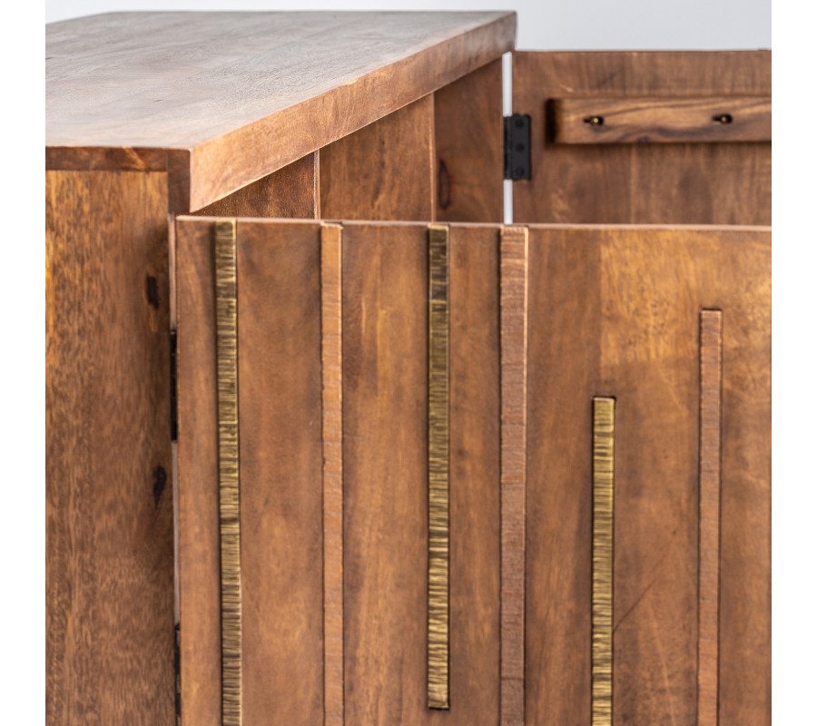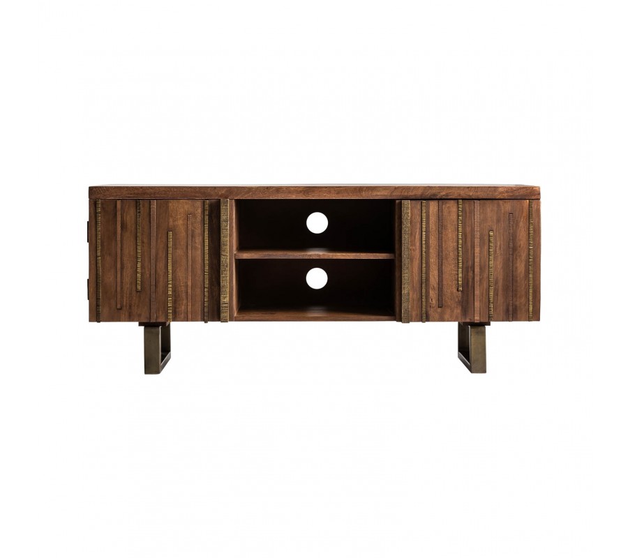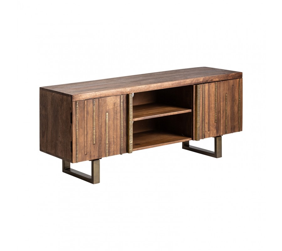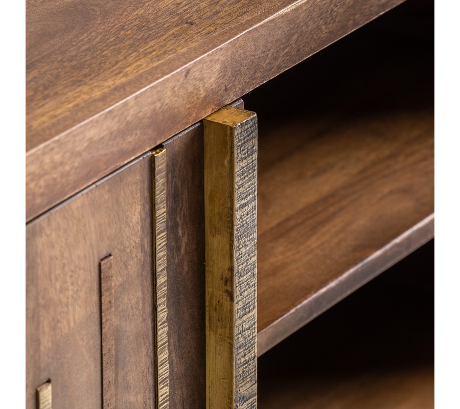 Štýlový a nadčasový TV stolík z našej kolekcie Domitilla predstavuje zaujímavý kúsok do vášho moderného interiéru. Je vyrobený z kvalitného mangového masívu tmavej farby, a na povrchu možno vidieť jemnú kresbu dreva. Dizajn stolíka je doplnený o štýlové zlaté železné prvky, ktoré ladia k zlatým železným nohám zaujímavého geometrického tvaru. Konštrukcia taktiež poskytuje jednoduchý prístup k upratovaniu. TV stolík Domitilla disponuje dvomi otvorenými poličkami a ďalšími poličkami s dvierkami. Poskytuje tak dostatok úložného priestoru pre rôzne predmety, elektroniku, časopisy. Skvelo vynikne v kombinácii s prírodnými farbami a doplnkami v zlatej farbe.