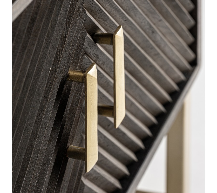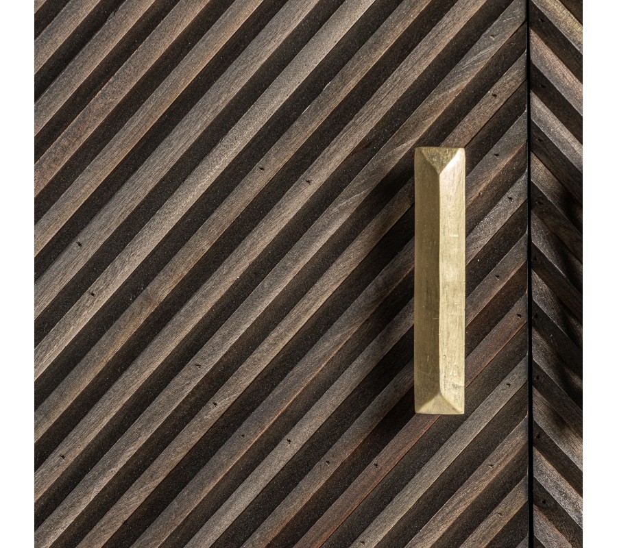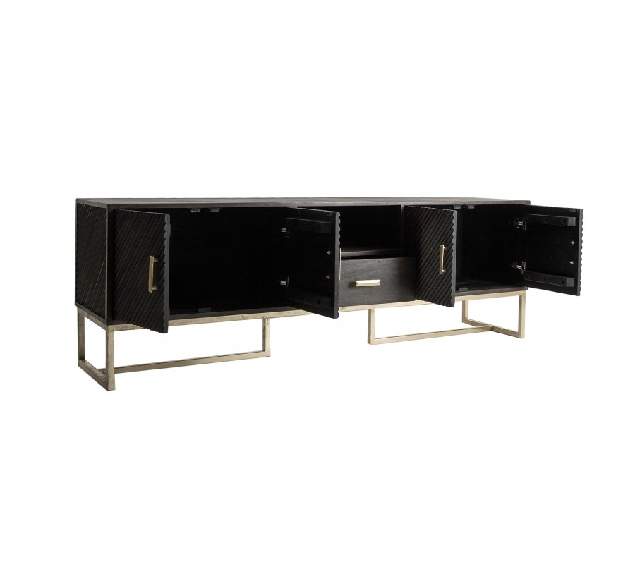 Moderný TV stolík Catia z masívneho dreva tmavohnedý je vyrobený z prírodného dreveného masívu. Spodnú časť tvorí kovová konštrukcia v zlatej farbe. Skladá sa zo zásuvky a štyroch otváraných dvierok, ktoré majú rúčky v zlatej farbe. Vo vnútri ukrývajú veľký úložný priestor. Keďže má dĺžku 200 cm je nadrozmerná, preto odporúčame obohatiť tento stolík o televíziu s veľkou uhlopriečkou. Dobre sa kombinuje s inými modernými produktmi, okrajovo aj v art-deco škále. Najmä vhodné farebné kombinácie sú hnedá, čierna. Celkovo pôsobí dominantne a zvýrazní Vašu obývačku.