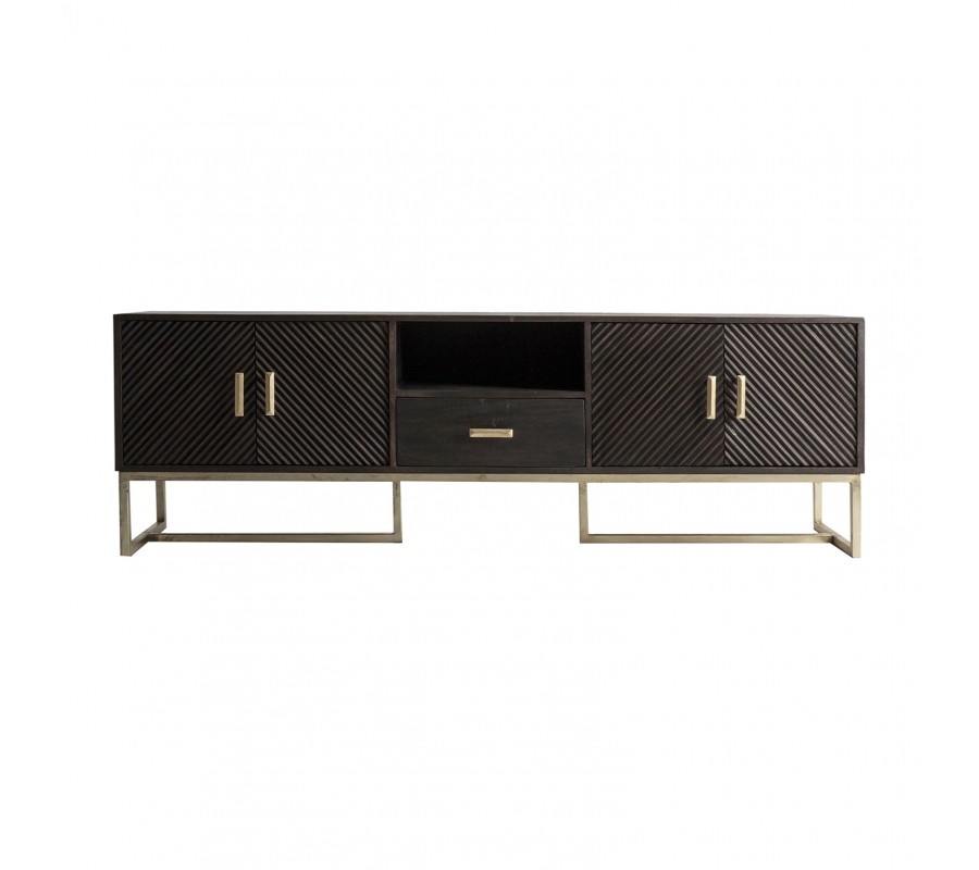 Moderný luxusný TV stolík Catia z masívneho dreva tmavohnedý 200 cm so zásuvkou a štyrmi dvierkami