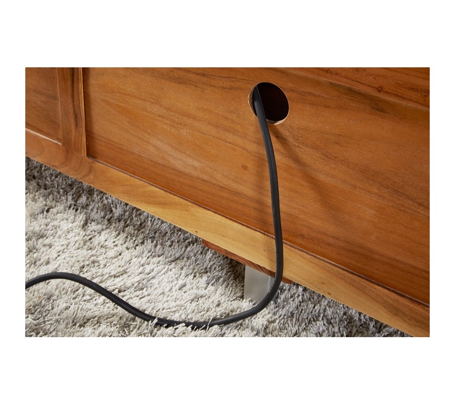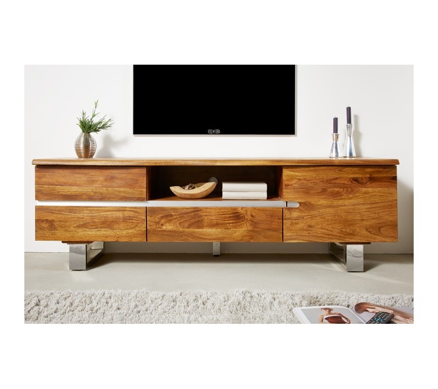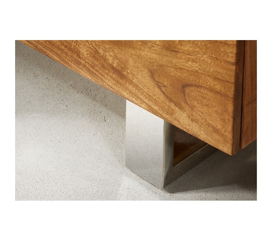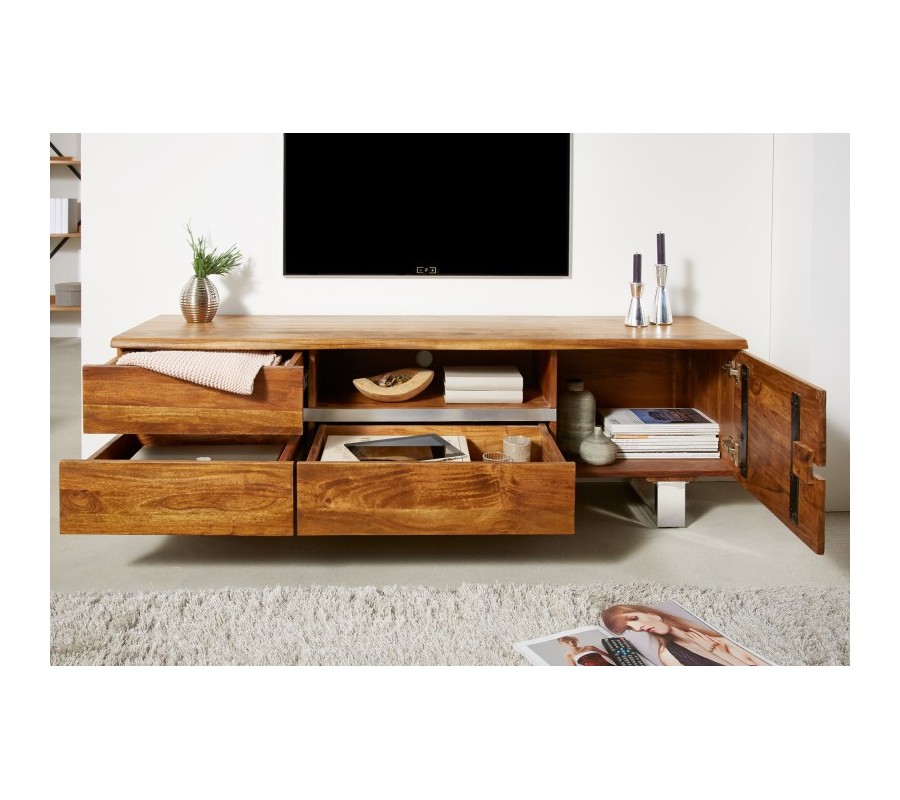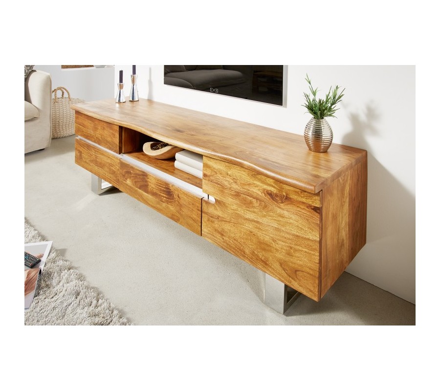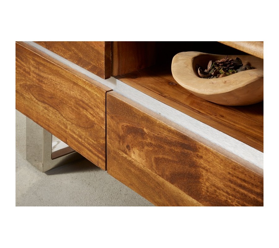 Štýlový TV stolík z kolekcie Mammut je vyrobený z masívneho akáciového dreva, ktoré sa vyznačuje svojou tvrdosťou a výraznou štruktúrou. Stolík ponúka odkladací priestor v podobe praktických zásuviek a jednej otvorenej police. Drevené telo stolíka je doplnené o kovové nohy v striebornej farbe. Jednoduchý dizajn predurčuje tento stolík do štýlových, moderne zariadených domácnosti.