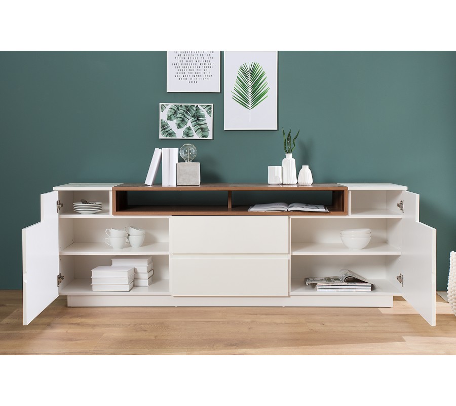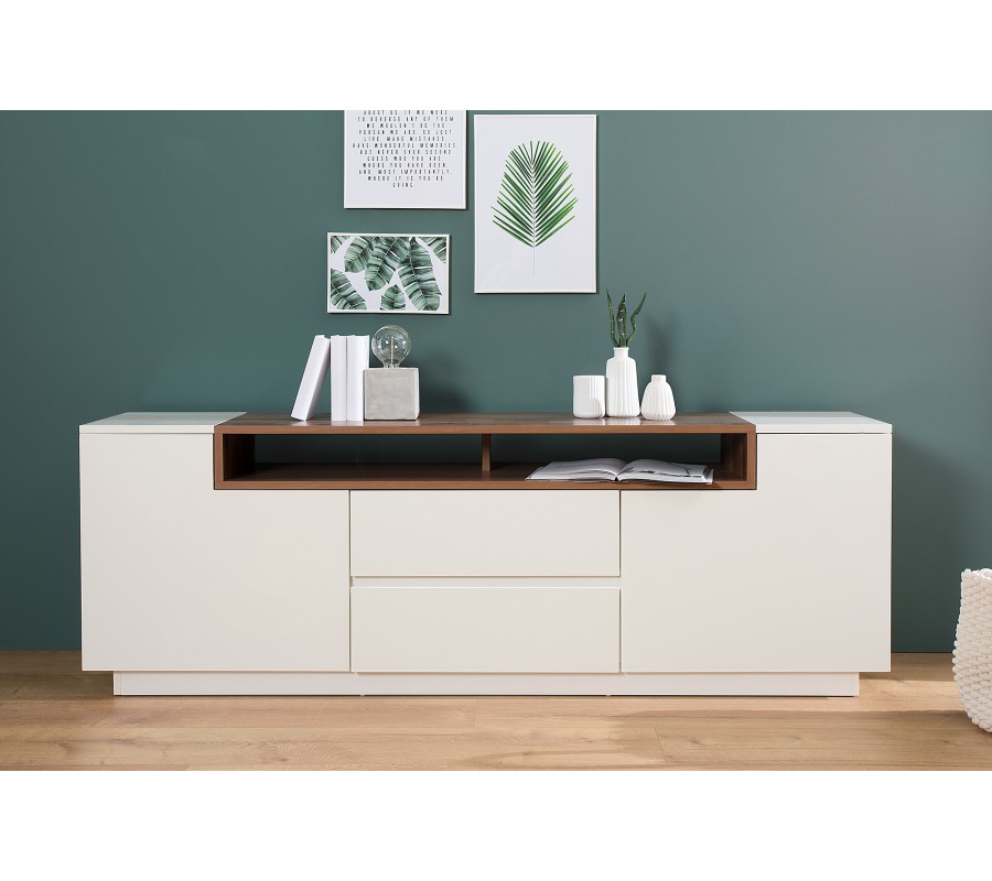 Dizajnový TV stolík Kingdom v bielom farebnom prevedení sa stane dokonalým doplnkom každej moderne zariadenej obývačky. Jednoduchý tvar v kombinácii s neutrálnymi farbami robí zo stolíka kúsok ktorý bude vhodne ladiť s farebne jemnými ale aj výraznými doplnkami a stenami. Stolík so svojou šírkou 180cm ponúka veľké množstvo praktického odkladacieho priestoru v podobe otvorenej police vo farbe orechového dreva a ďalších dvoch zásuviek a skriniek. Materiál: lakované MDF, dýha z pravého orechového dreva