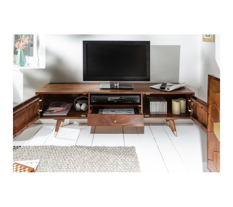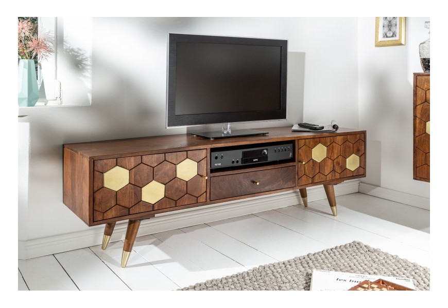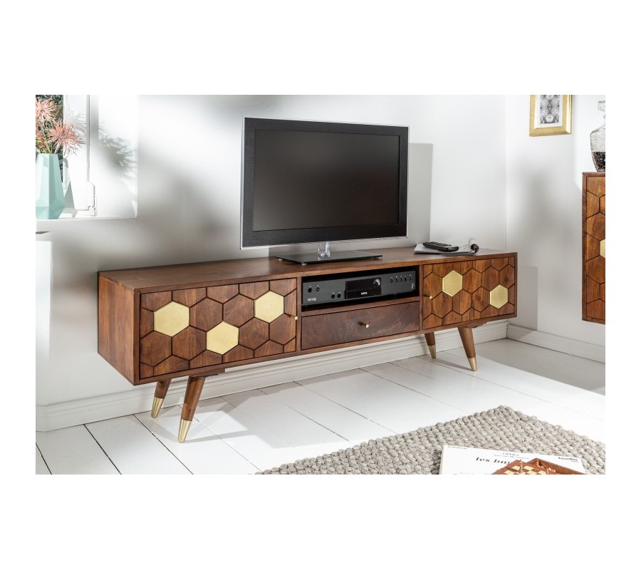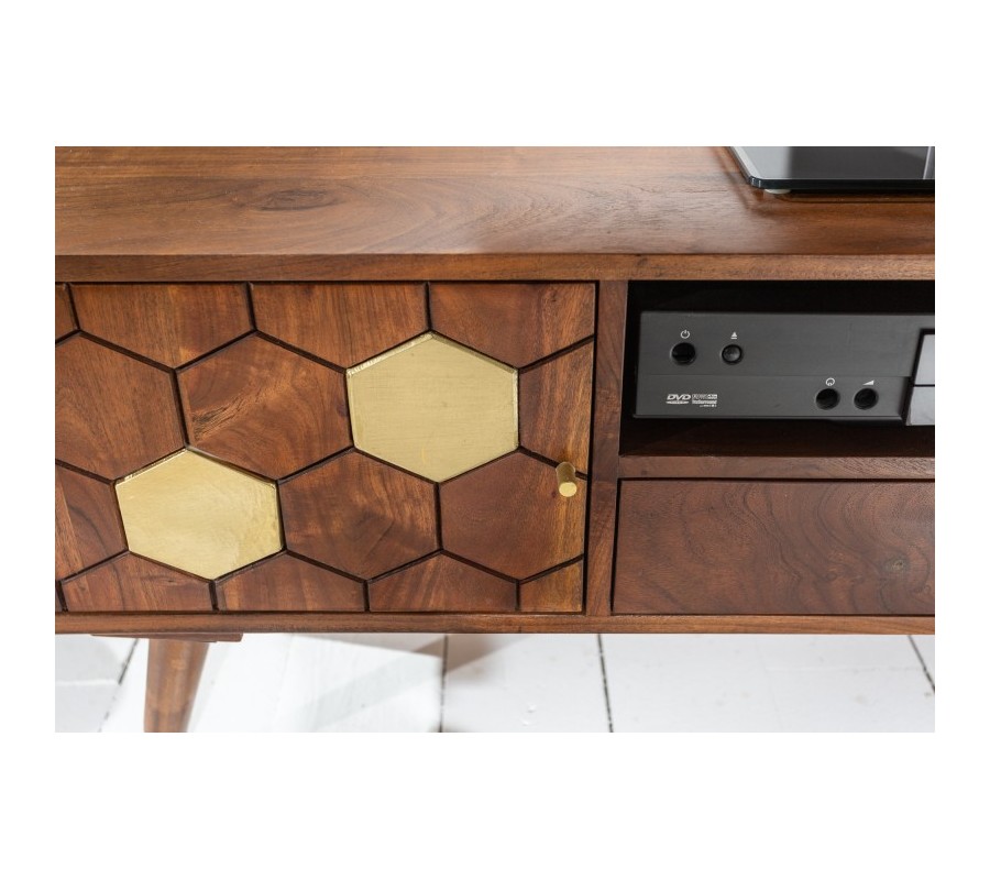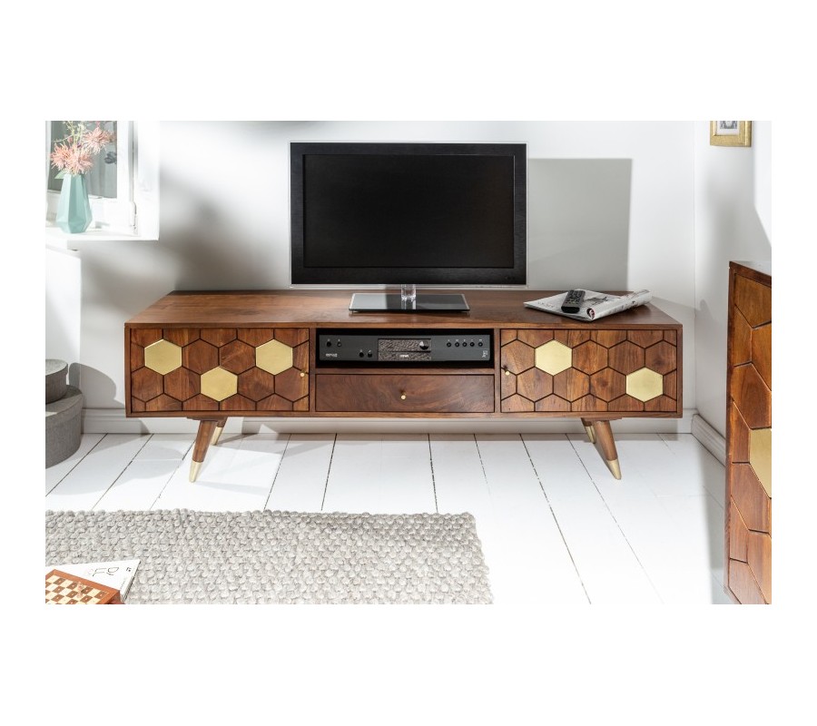 Masívny TV stolík Roslin z akáciového dreva s organickým dizajnom a zlatými prvkami 140cm