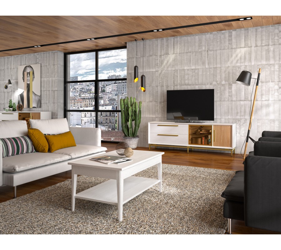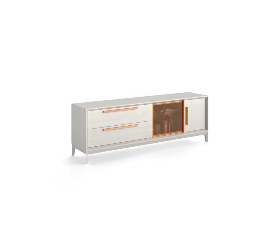 Luxusný TV stolík Estoril je vyrobený z masívneho dreva, ktoré je doplnené sklenenými časťami a kovovými prvkami. Farebné prevedenie kovových častí je k dispozícii v troch dizajnových odtieňoch. Okrem voľby kovových častí si podľa individuálnych potrieb a štýlu interiéru zvolíte aj povrchové prevedenie masívnych častí stolíka. Môžete siahnuť po neutrálnych odtieňoch hnedej, bielej a sivej alebo sa rozhodnúť pre odvážnejšie odtiene zelenej, modrej či žltej. Okrem praktických zásuviek na drobné predmety obsahuje TV stolík aj úložný priestor s poličkou za luxusnými sklenenými a masívnymi dvierkami. Moderný masívny TV stolík Estoril odporúčame doplniť prvkami z rovnomennej kolekcie a vytvoriť si vo vašom interiéri praktický dizajnový udržateľný priestor.