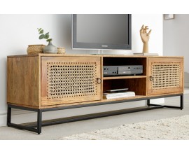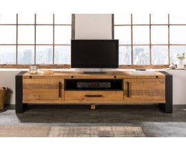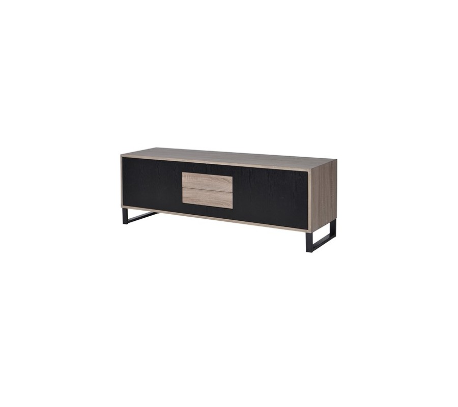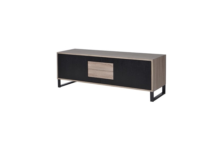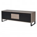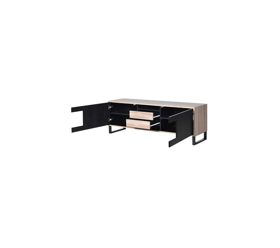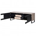 Moderný televízny stolík z našej kolekcie Leniar vás už na prvý pohľad zaujme, a to nielen vďaka svojmu jedinečnému dizajnu, kombinujúcemu čiernu farbu s drevom, ale aj vďaka množstvu úložného priestoru, ktorý poskytuje v podobe dvoch priestranných skriniek s poličkami, dvoch praktických zásuviek, nachádzajúcich sa v strede stolíka, medzi dvoma dvierkami skriniek a aj dvoch menších častí nachádzajúcich sa nad a pod zásuvkami. Na výrobu TV stolíka bol použitý kvalitný drevený masív. Dvierka v čiernej farbe vytvárajú príjemný kontrast s prirodzenou svetlou drevenou farbou čiel zásuviek a rámu, ktoré si vďaka jedinečnej povrchovej úprave zachovali svoju prírodnú drevenú štruktúru. Čierne kovové nožičky mu dodávajú istú strohosť, ktorú ale bledé tóny dreva dokonale vyvažujú a vytvárajú naozaj harmonický kúsok, ktorý perfektne zapadne do miestností s bledou farebnosťou a farebne výraznejšími doplnkami ako sú obrazy, sošky, či koberce.