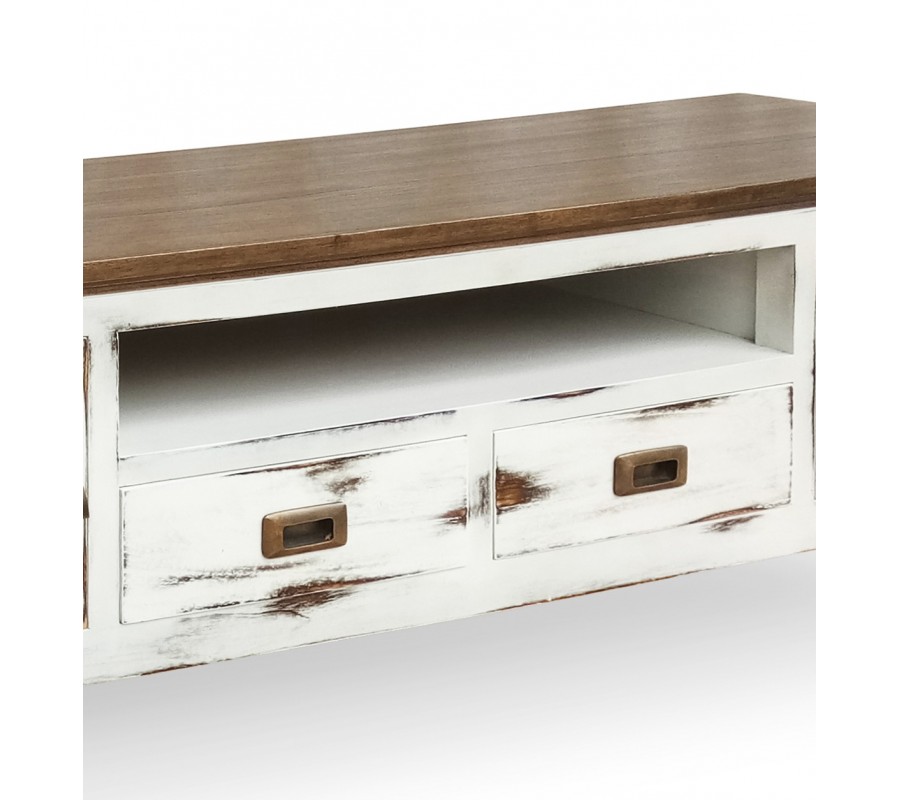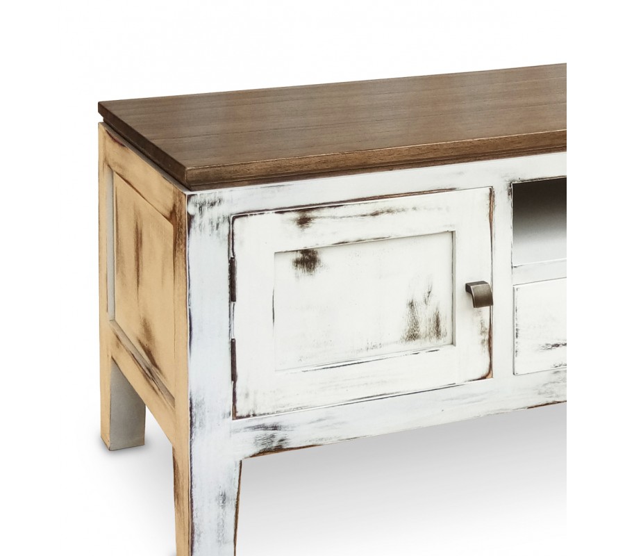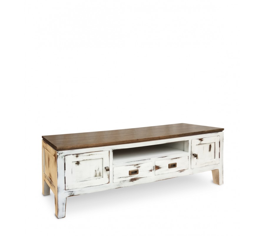 Štýlový a atypický televízny stolík z kolekcie masívneho nábytku Blanc Vás zaručene osloví najmä vďaka svojemu dizajnovému prevedeniu. Masívne drevo s bielym náterom, ktorý necháva vyniknúť nezameniteľnú kresbu dreva mindi pôsobí naozaj dizajnovo. Tento neobvyklý kúsok Vás zaručene poteší i množstvom úložného priestoru, ktorý Vám za dvierkami skriniek ponúka.