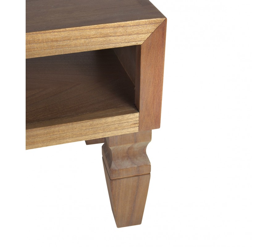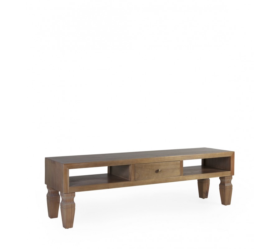 Štýlový a jedinečný televízny stolík z kolekcie masívneho nábytku Madera Vás zaručene osloví najmä vďaka svojemu dizajnovému prevedeniu. Masívne drevo v svetlých farbách, ktoré necháva vyniknúť nezameniteľnú kresbu dreva je dozdobené distingvovaným zlatým prvkom v podobe rukoväti na priestrannej zásuvke, ktorá Vás spolu s dvoma policami poteší množstvom úložného priestoru, ktorý spolu ponúkajú.
