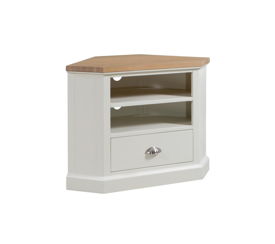 Dizajnový rohový TV stolík z kolekcie nábytku Valence v sebe vkusne prepája moderné a vidiecke prvky. Praktický priestor poskytujú dve otvorené police a zásuvka s veľkou, štýlovou kovovu úchytkou. Príjemná farebná kombinácia svetlého dubového, bieleho dreva a strieborných prvkov robí z tohto stolíka jednoducho kombinovateľný kúsok, ktorý si svoje miesto nájde vo farebne neutrálnych, ale aj pestrých priestoroch.