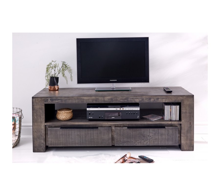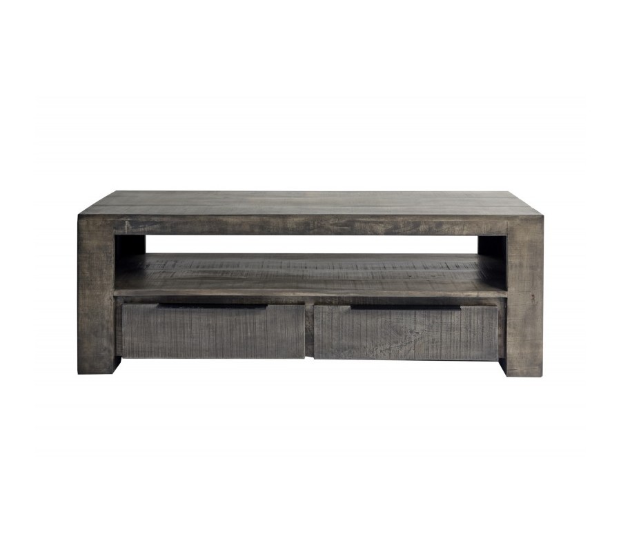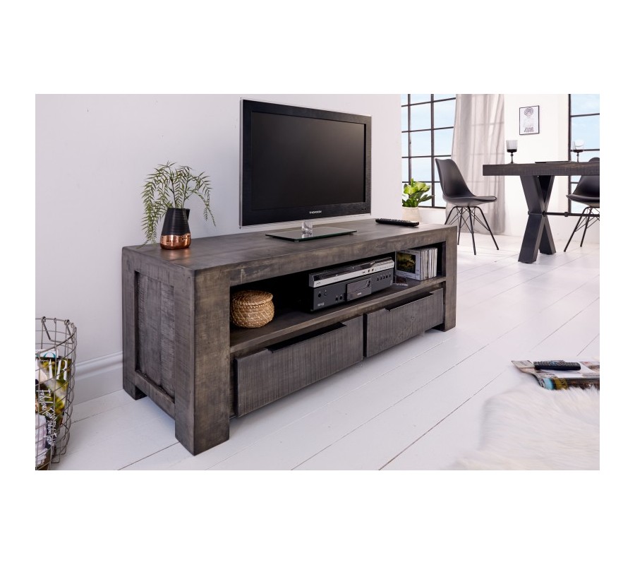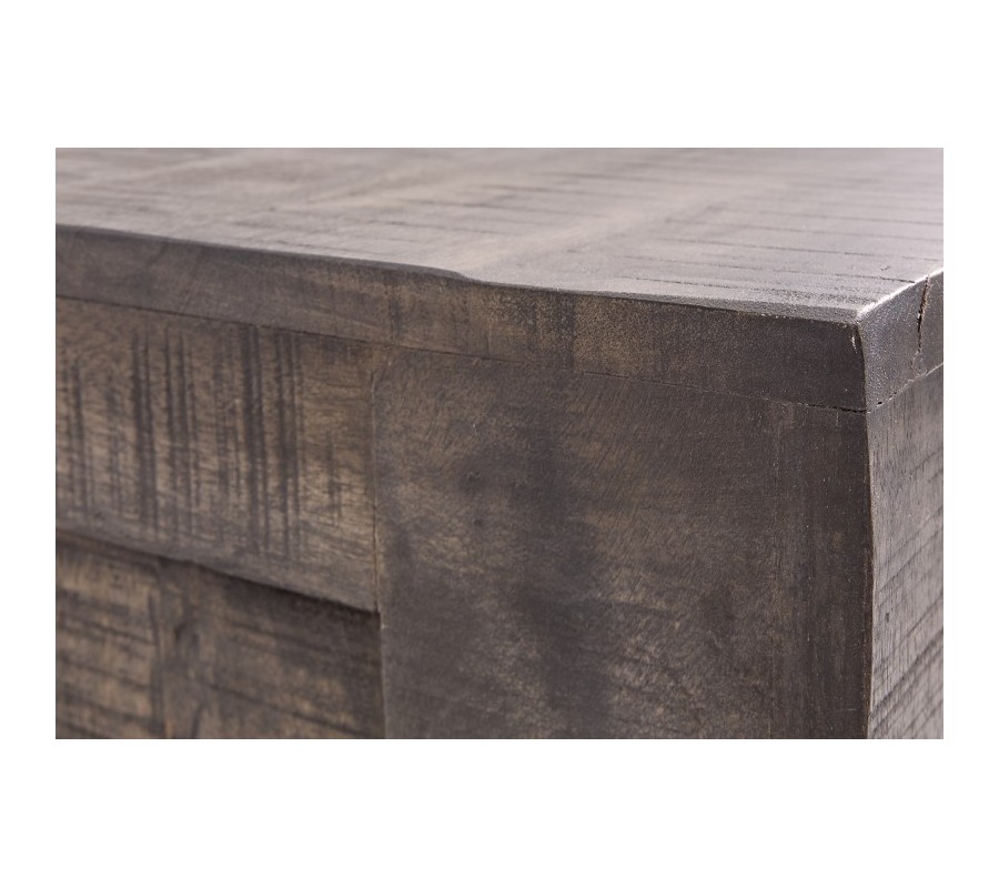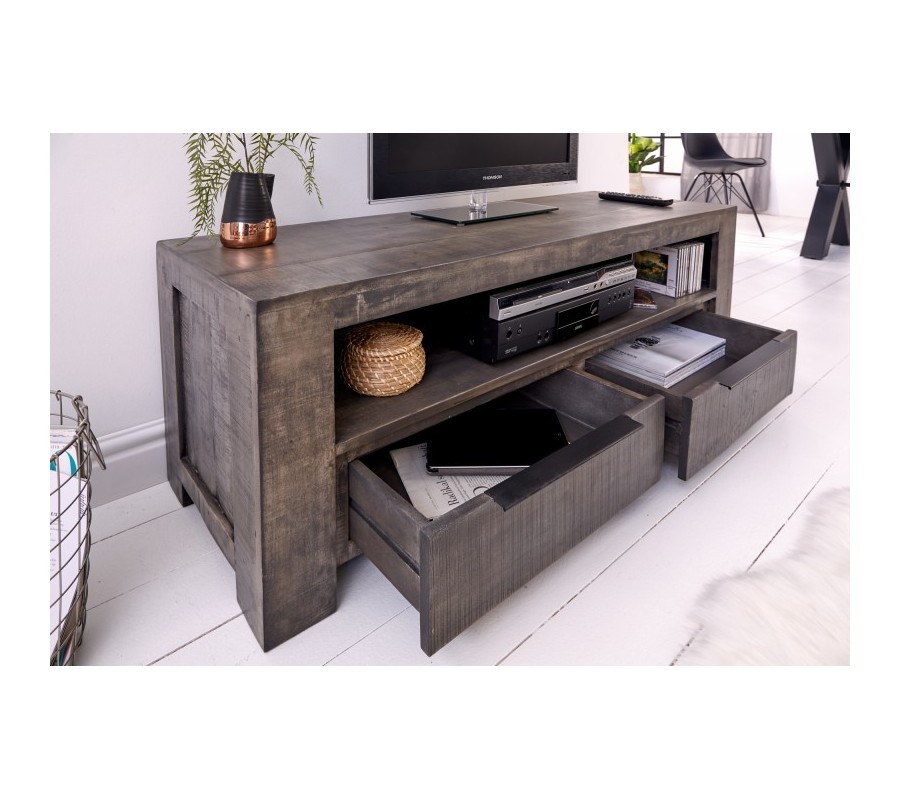 Exkluzívny TV stolík Svea je štýlovým doplnkom do vášho moderného či industriálneho interiéru. Svojím zaujímavým dizajnom osloví na prvý pohľad a vďaka klasickému obdĺžnikovému tvaru je aj veľmi praktický. Taktiež disponuje dvomi zásuvkami a priestorom pre elektroniku či DVD. Poskytuje pre vás tak dostatočný úložný priestor. Univerzálna sivá farba sa ľahko kombinuje a skvelo vynikne v modernej zariadených domácnostiach ladených v svetlejšom kolorite. TV stolík Svea je vyrobený z masívnemu mangového dreva, ktorého štruktúru a zaujímavú kresbu možno vidieť na jeho povrchu. Stolík tak dostáva svoj unikátny a jedinečný vzhľad, ktorý môže obohatiť aj váš domov!