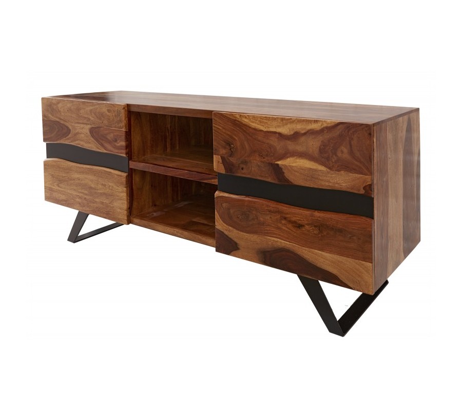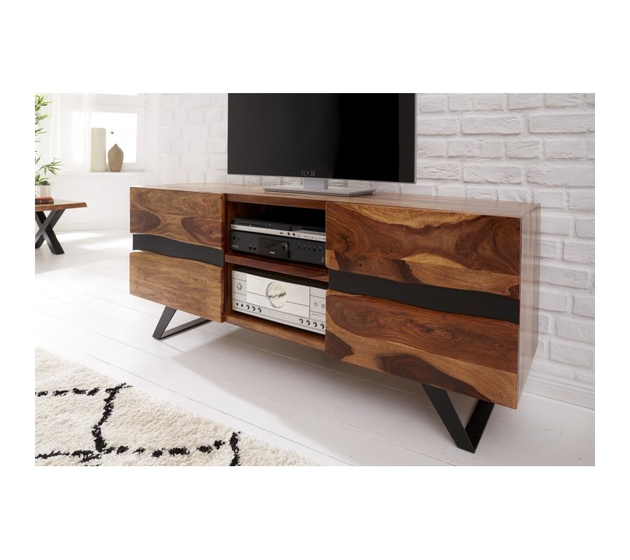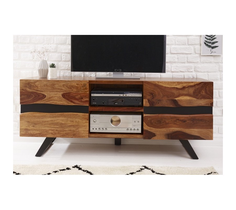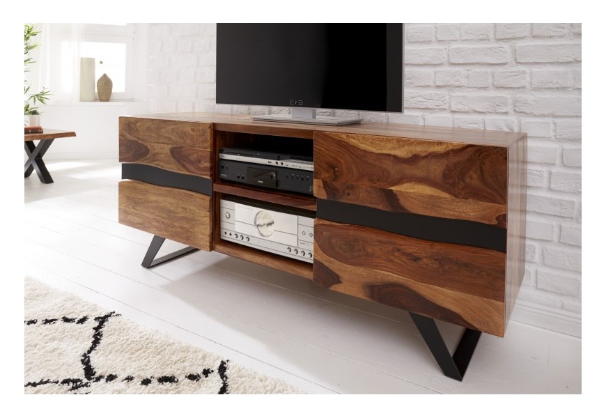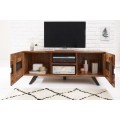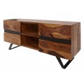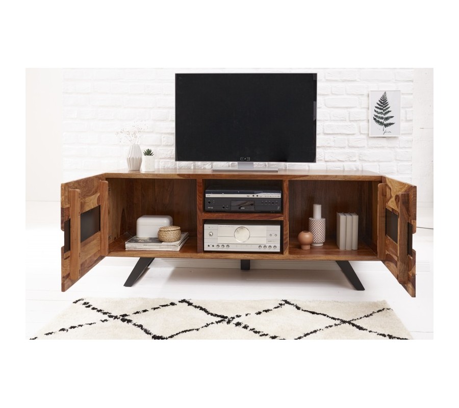 Dizajnový TV stolík Sheesham z masívneho dreva s dvomi dvierkami a čiernymi kovovými nohami 160cm