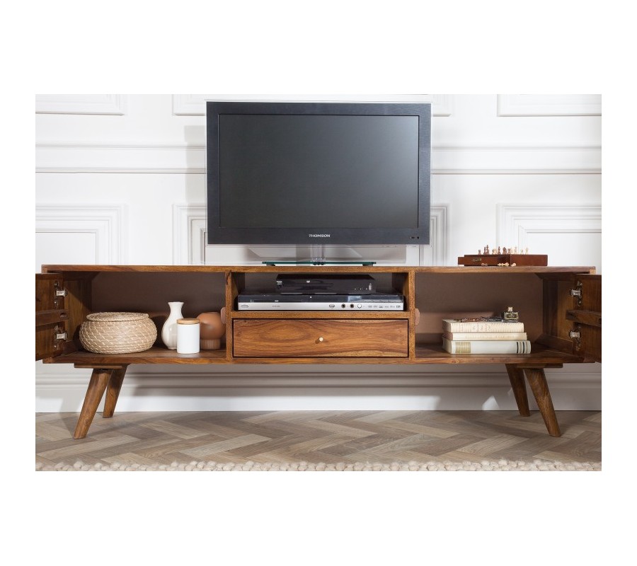 Dizajnový a naozaj nadčasový televízny stolík z kolekcie masívneho nábytku Mozaika s jemným nádychom retro štýlu dokáže príjemne ozvláštniť i fádnu obývaciu miestnosť alebo lobby. Vkusná hnedá prirodzená farba masívneho dreva dokonale ladí s nenápadnými rukoväťami a spolu vytvárajú naozaj nápaditý a minimalistický obraz. TV stolík Mozaika odporúčame kombinovať najmä s jemnými farebnými tónmi a inými domov zútulňujúcimi kúskami, či už sa jedná o koberec s vlasom, pletený taburet alebo množstvo vankúšov, zaručene ho veľmi jednoducho zakomponujete do svojej domácnosti.