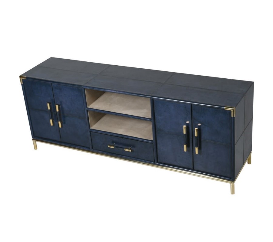 Kožený TV stolík Pellia Azul v tmavomodrej farbe so zásuvkami, dvierkami a poličkami 163cm