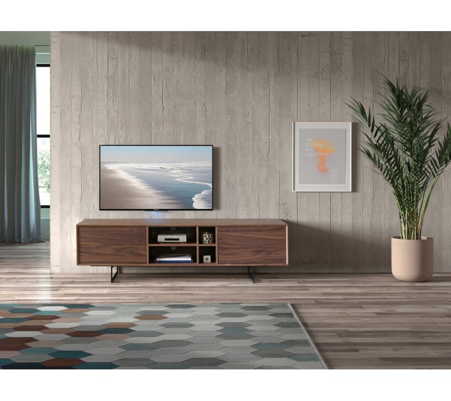 Dizajnový TV stolík Chrysler v hnedej farbe s úložným priestorom s čiernymi nožičkami 180cm
